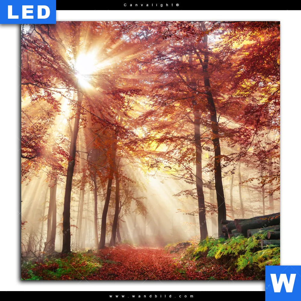 Canvalight® TEX Leuchtbild | Sonnenlicht im nebligen Wald | Quadrat