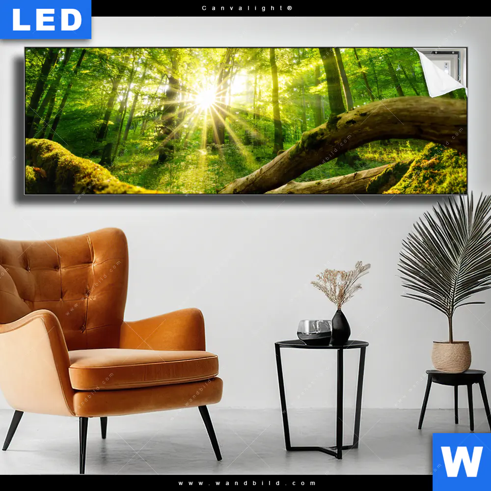 Canvalight® TEX Leuchtbild | Sonnenstrahlen im dichten Wald | Panorama