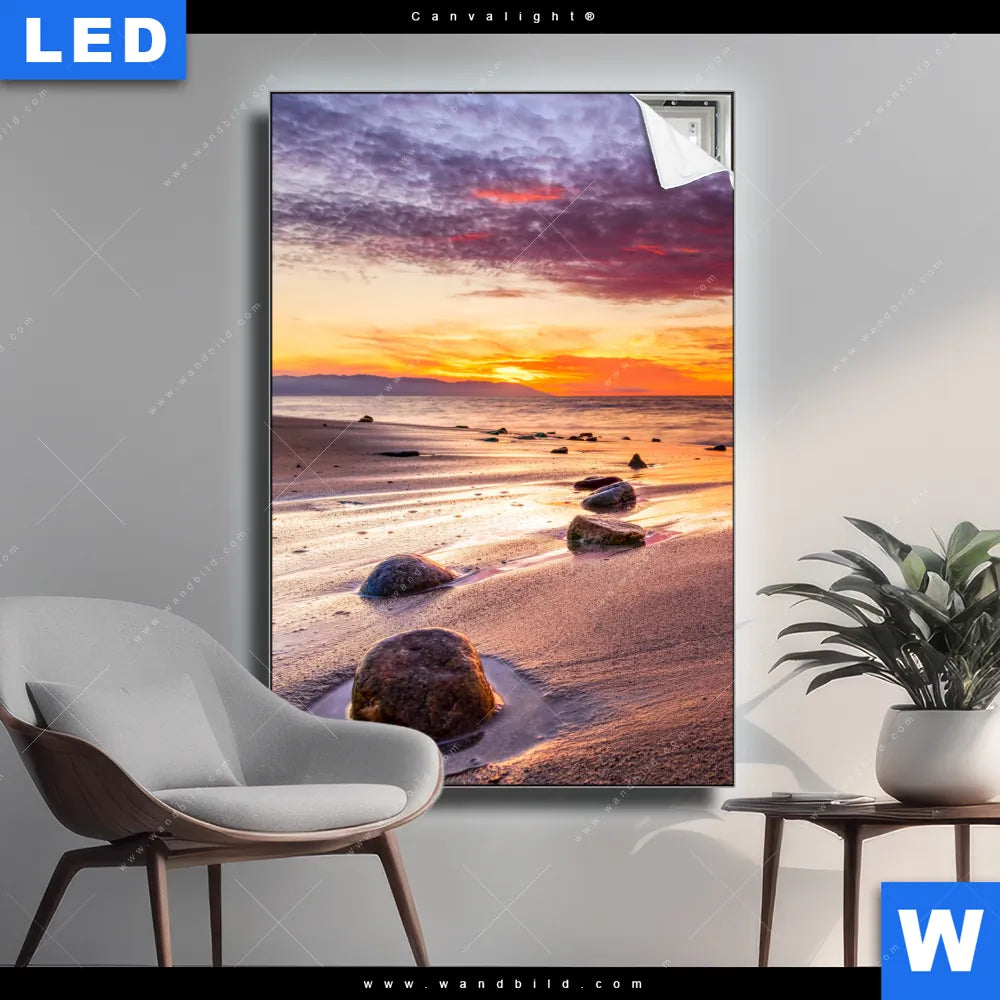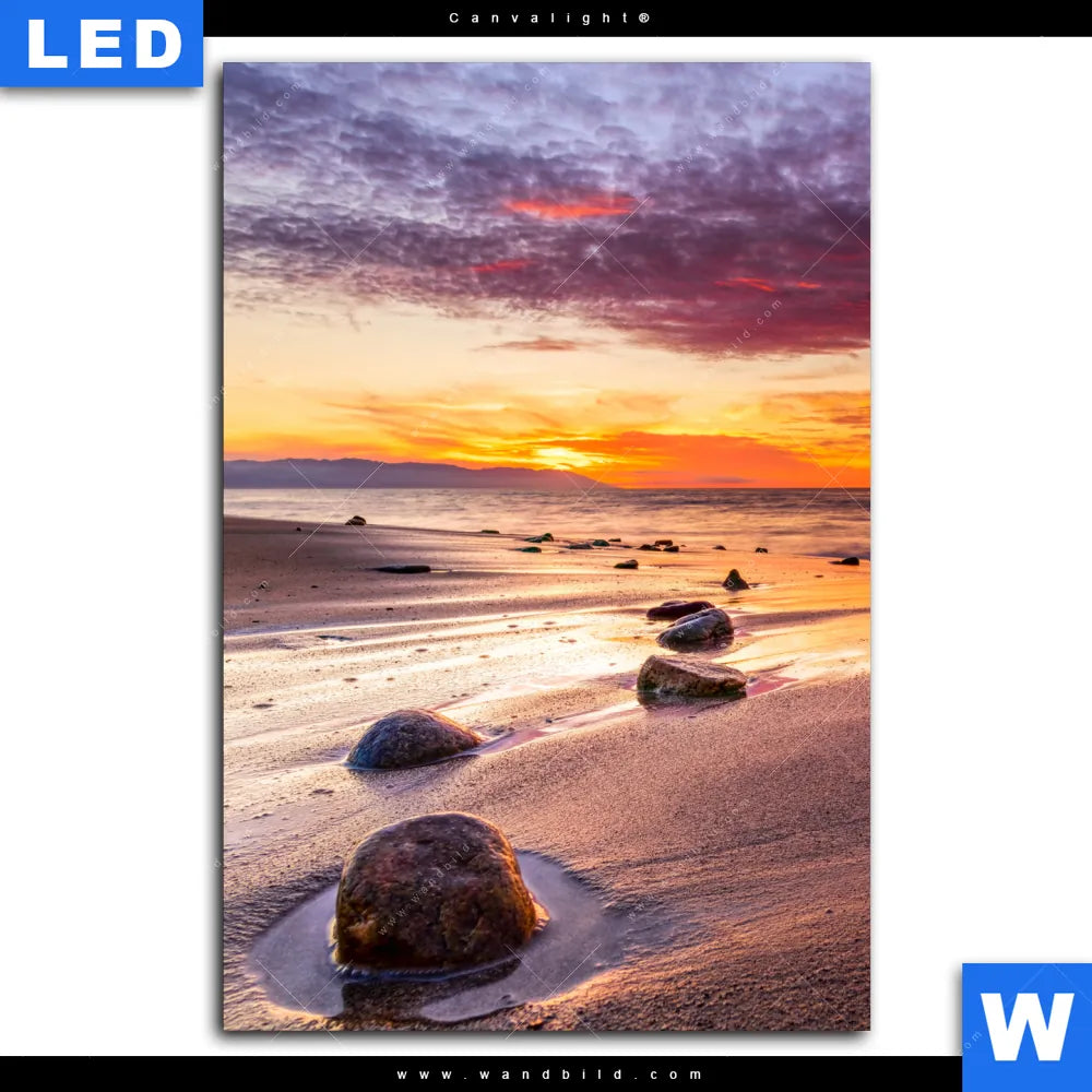 Canvalight® TEX Leuchtbild | Sonnenuntergang am Strand mit Felsen | Hochformat