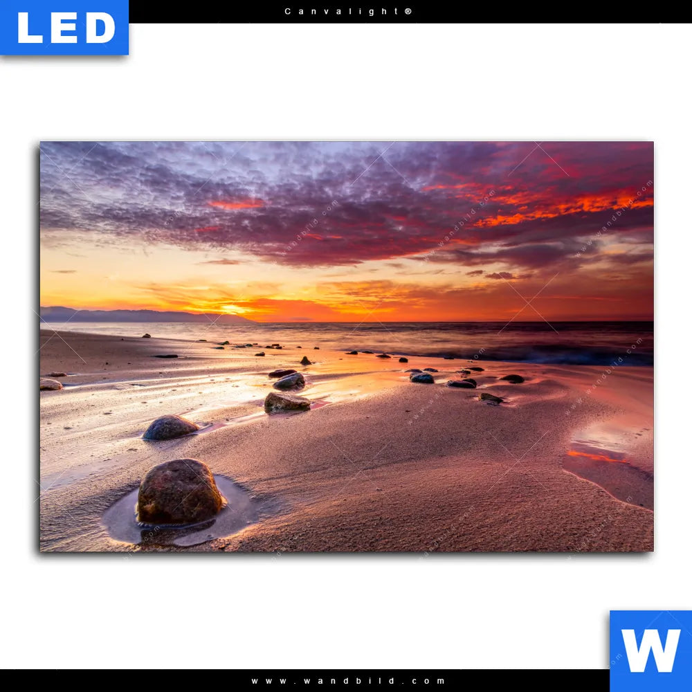 Canvalight® TEX Leuchtbild | Sonnenuntergang am Strand mit Felsen | Querformat