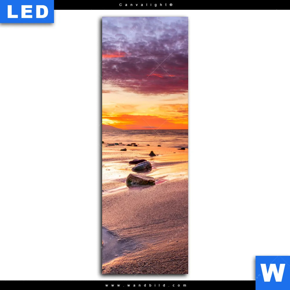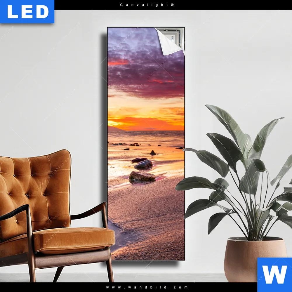 Canvalight® TEX Leuchtbild | Sonnenuntergang am Strand mit Felsen | Schmal