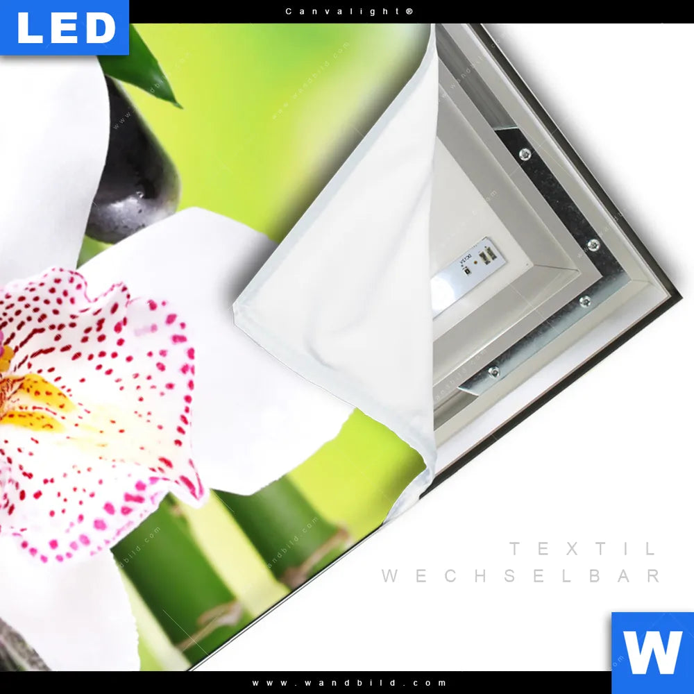 LED-Textilrahmen-Bild mit austauschbarem Blumen - Botanik, Buddha - Feng Shui Textil-Druck (Wechselbild)