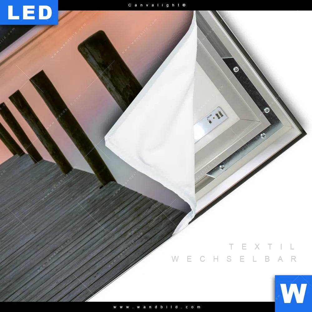 Canvalight® TEX Leuchtbild | Steg in den Sonnenuntergang | Querformat