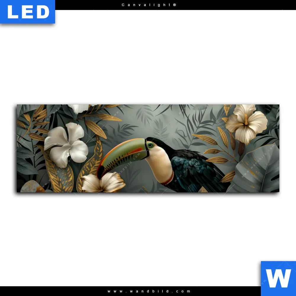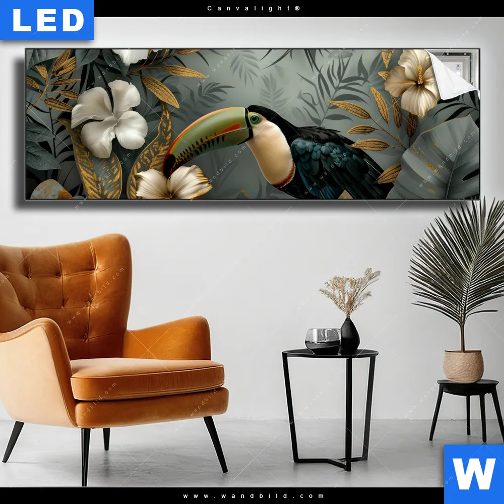 Canvalight® TEX Leuchtbild | Tukan im goldenen Regenwald | Panorama