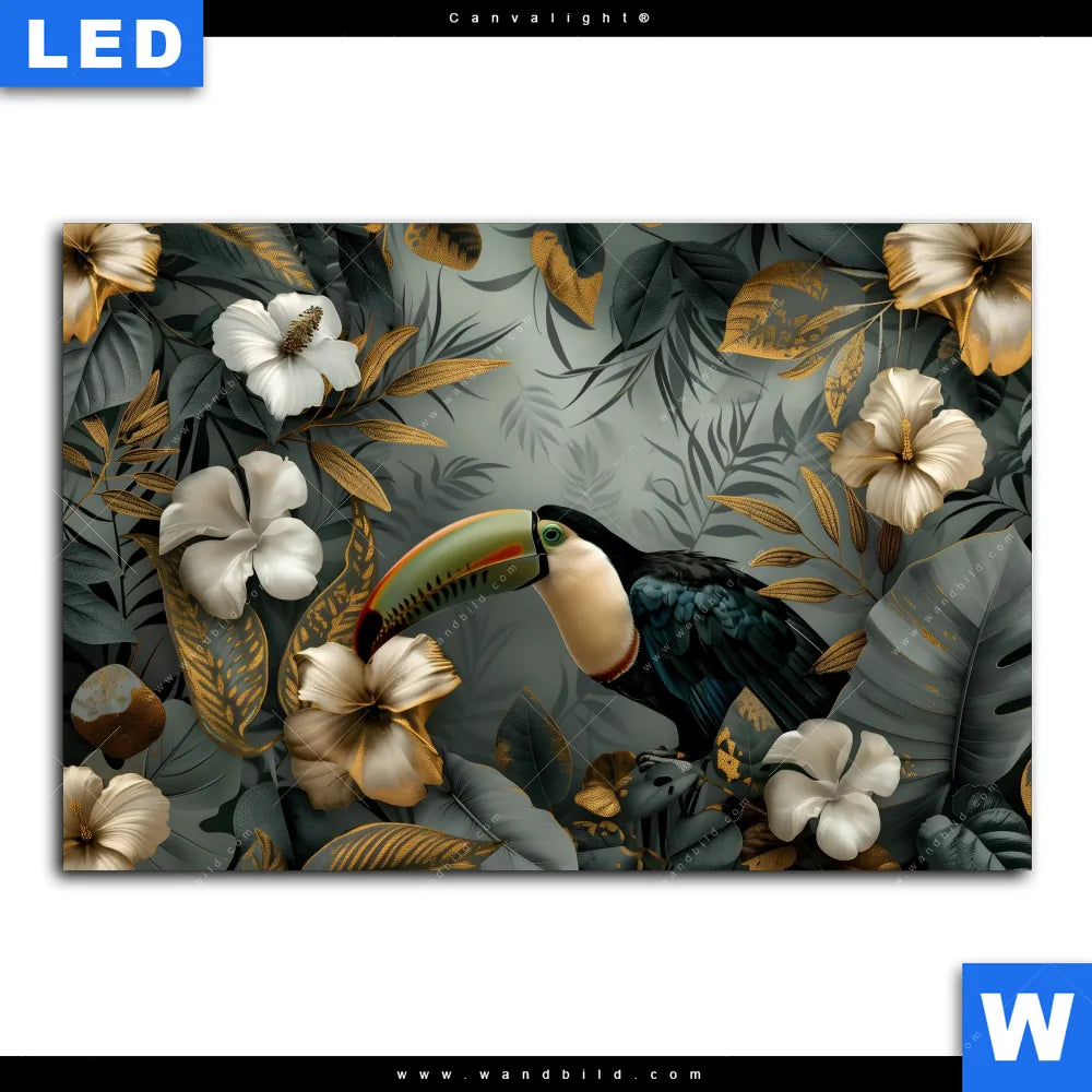Canvalight® Leuchtbild | Tukan im goldenen Regenwald | Querformat
