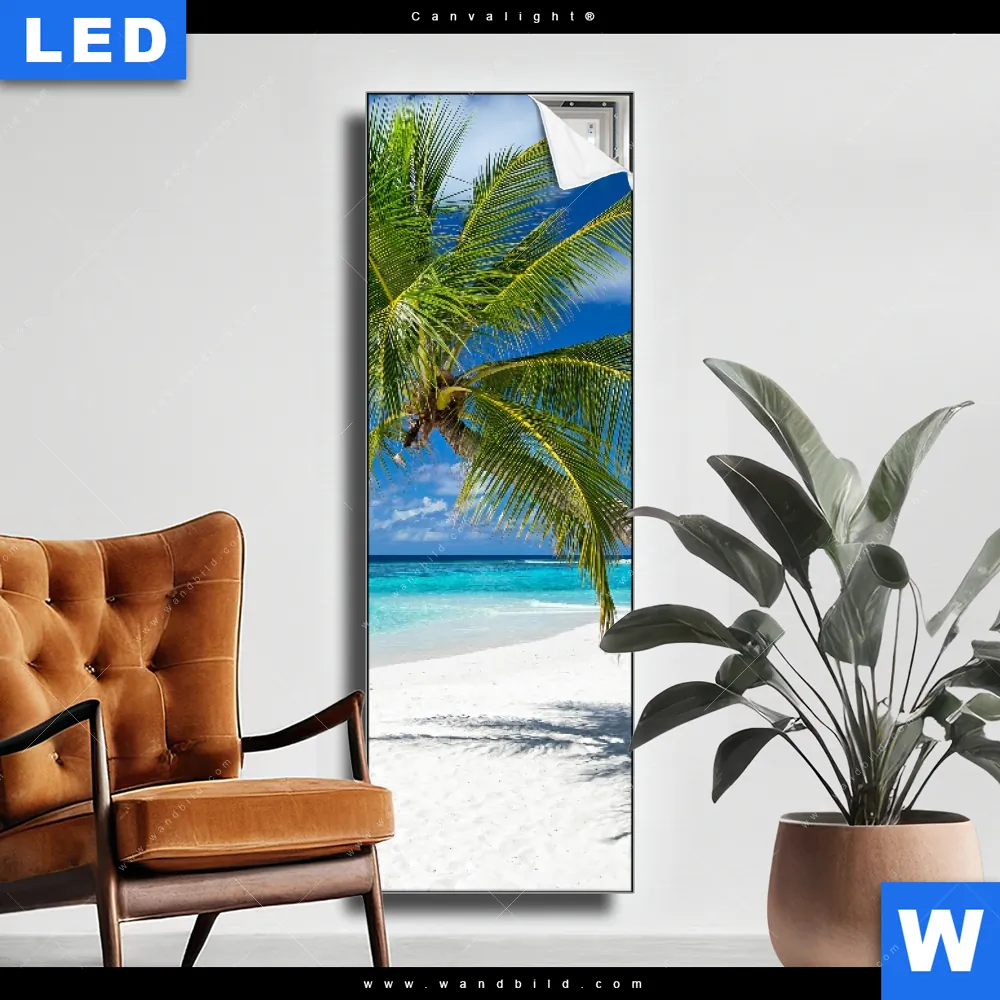 Canvalight® TEX Leuchtbild | Weißer Strand & Kokospalme | Schmal