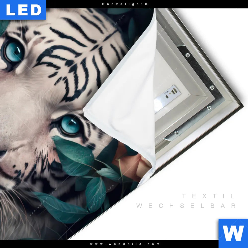 Canvalight® TEX Leuchtbild | Weißer Tiger mit blauen Augen zwischen Blumen | Hochformat
