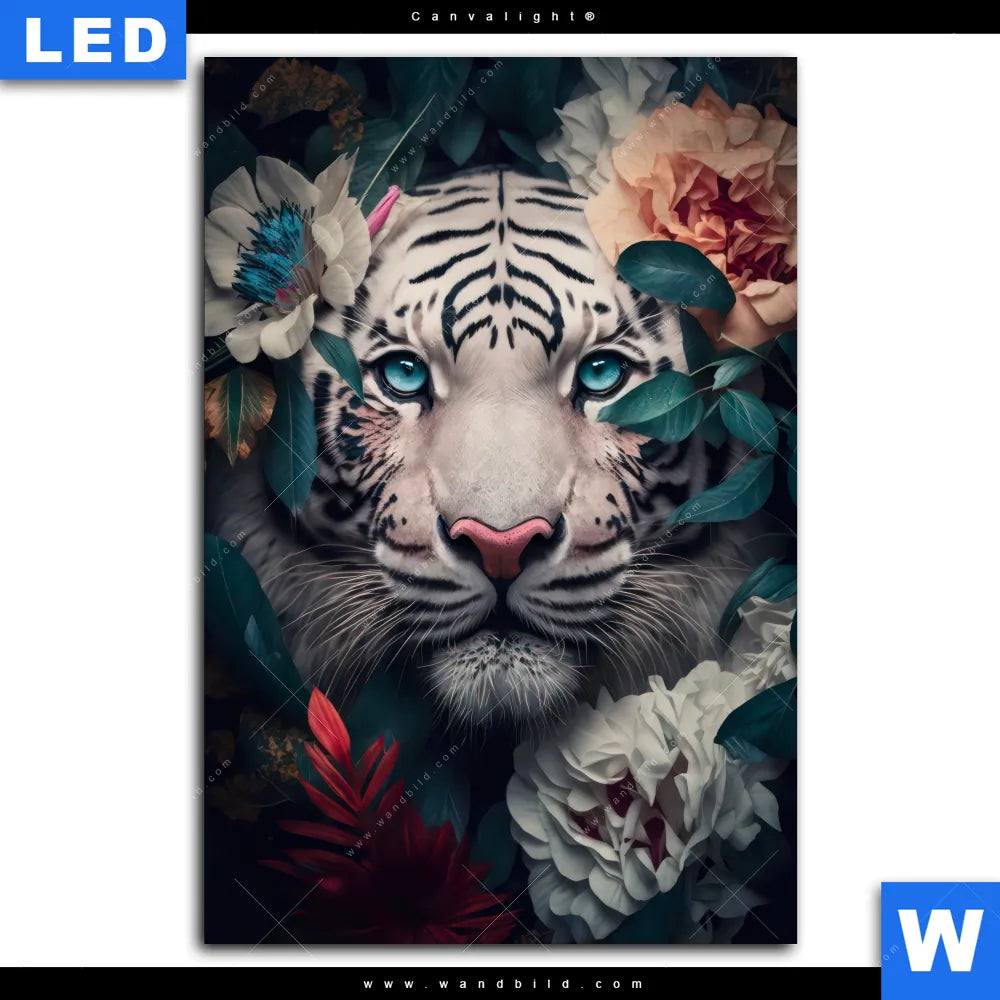 Canvalight® Leuchtbild | Weißer Tiger mit blauen Augen zwischen Blumen | Hochformat
