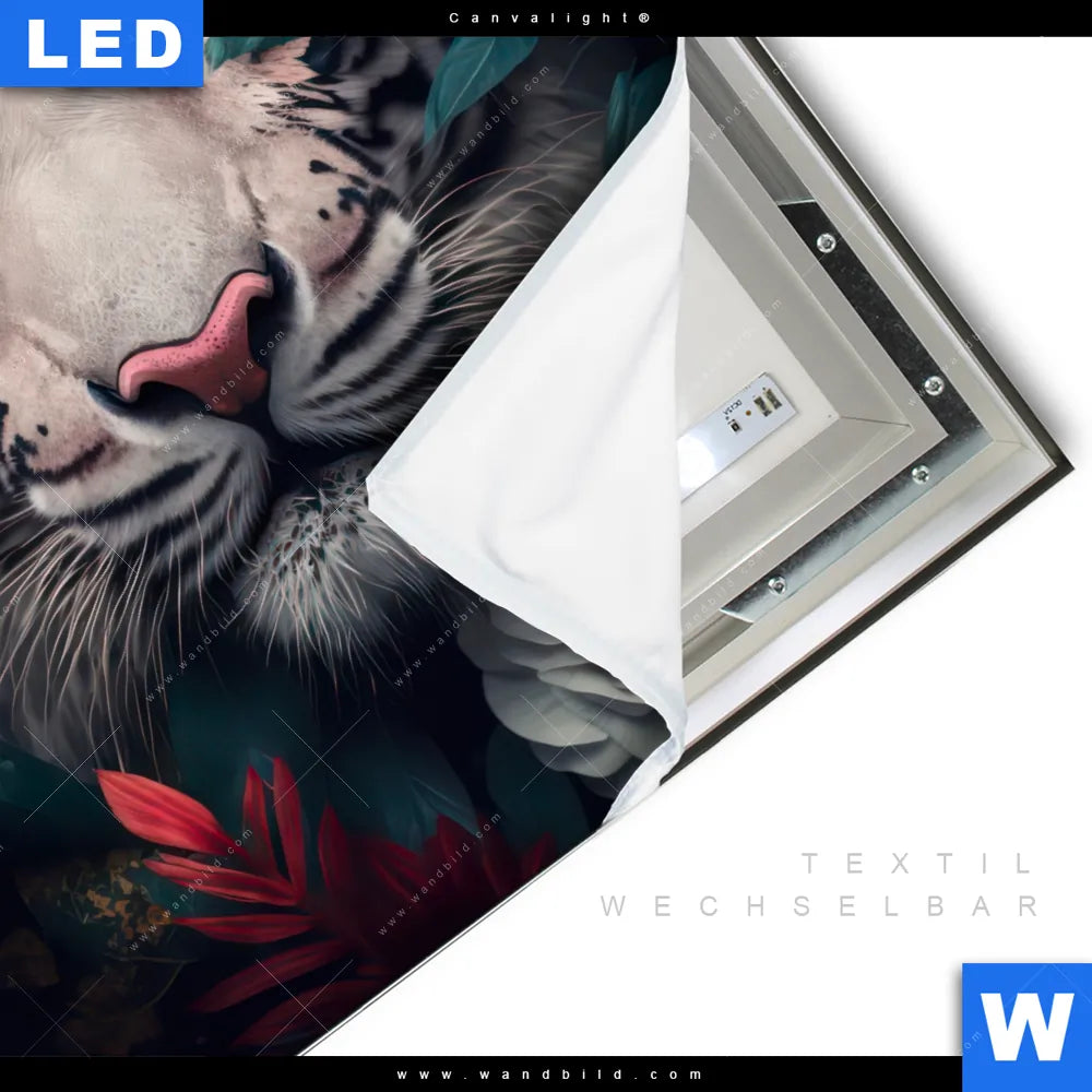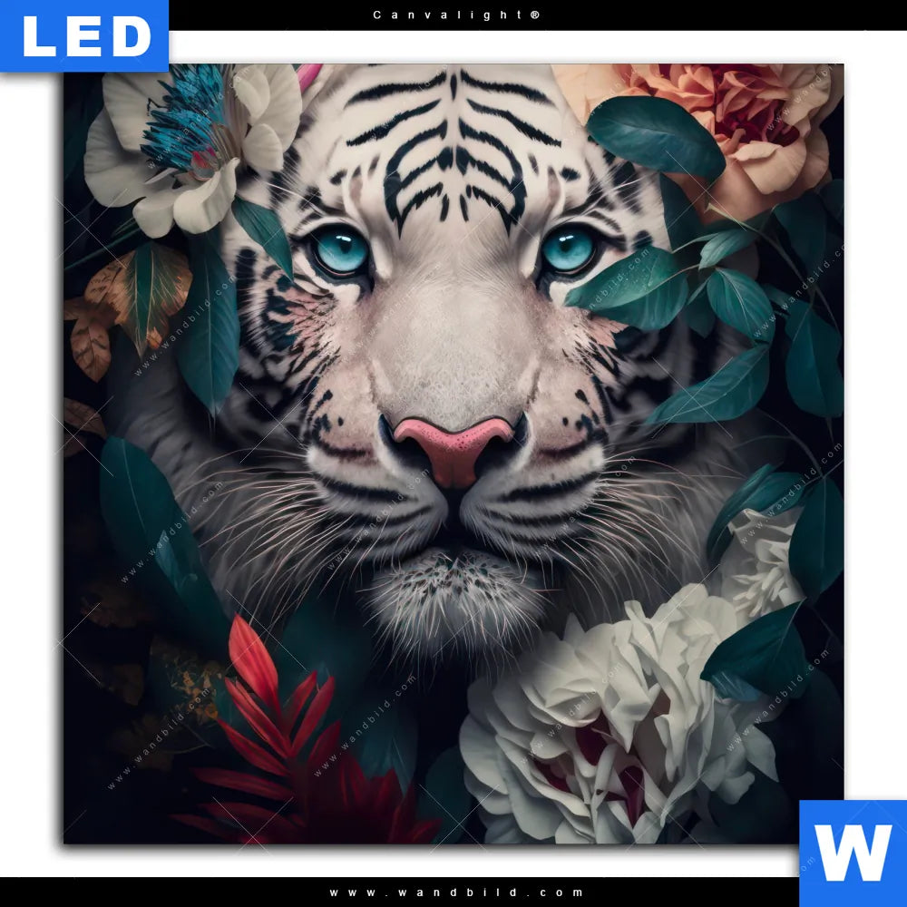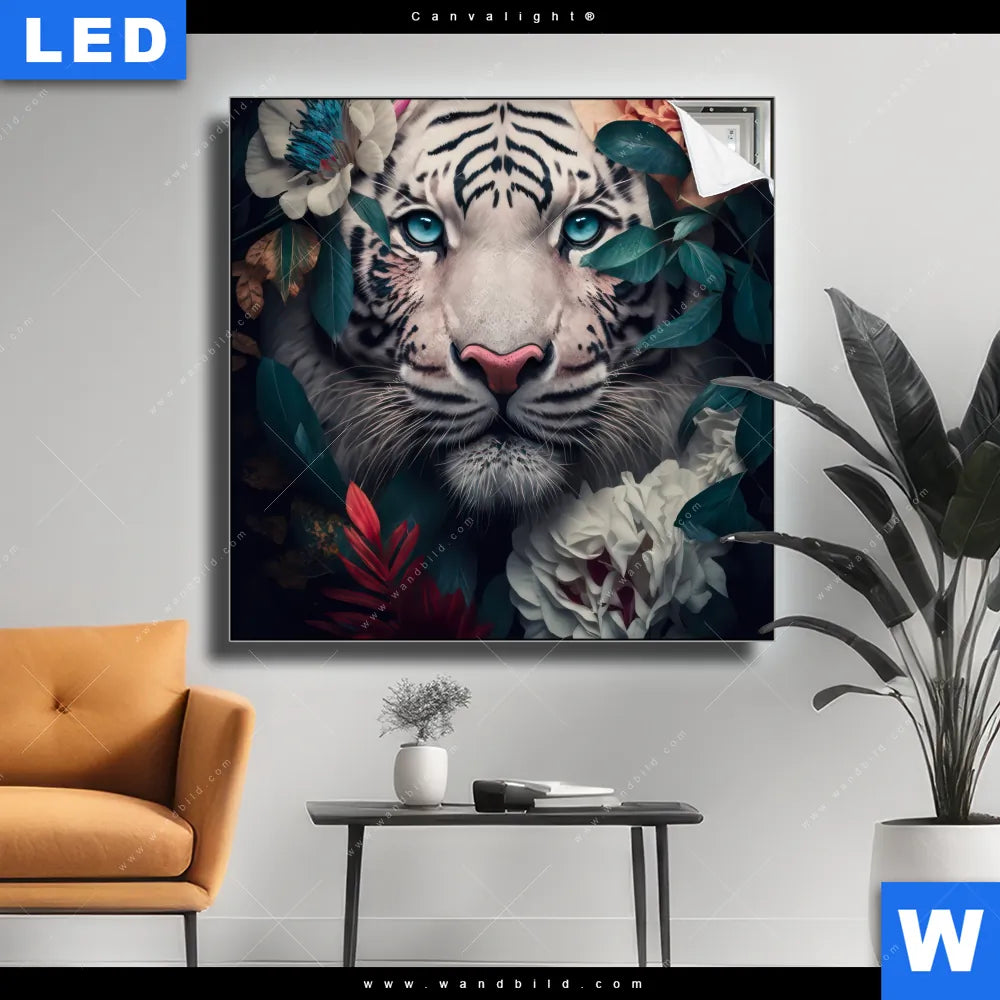 Canvalight® TEX Leuchtbild | Weißer Tiger mit blauen Augen zwischen Blumen | Quadrat
