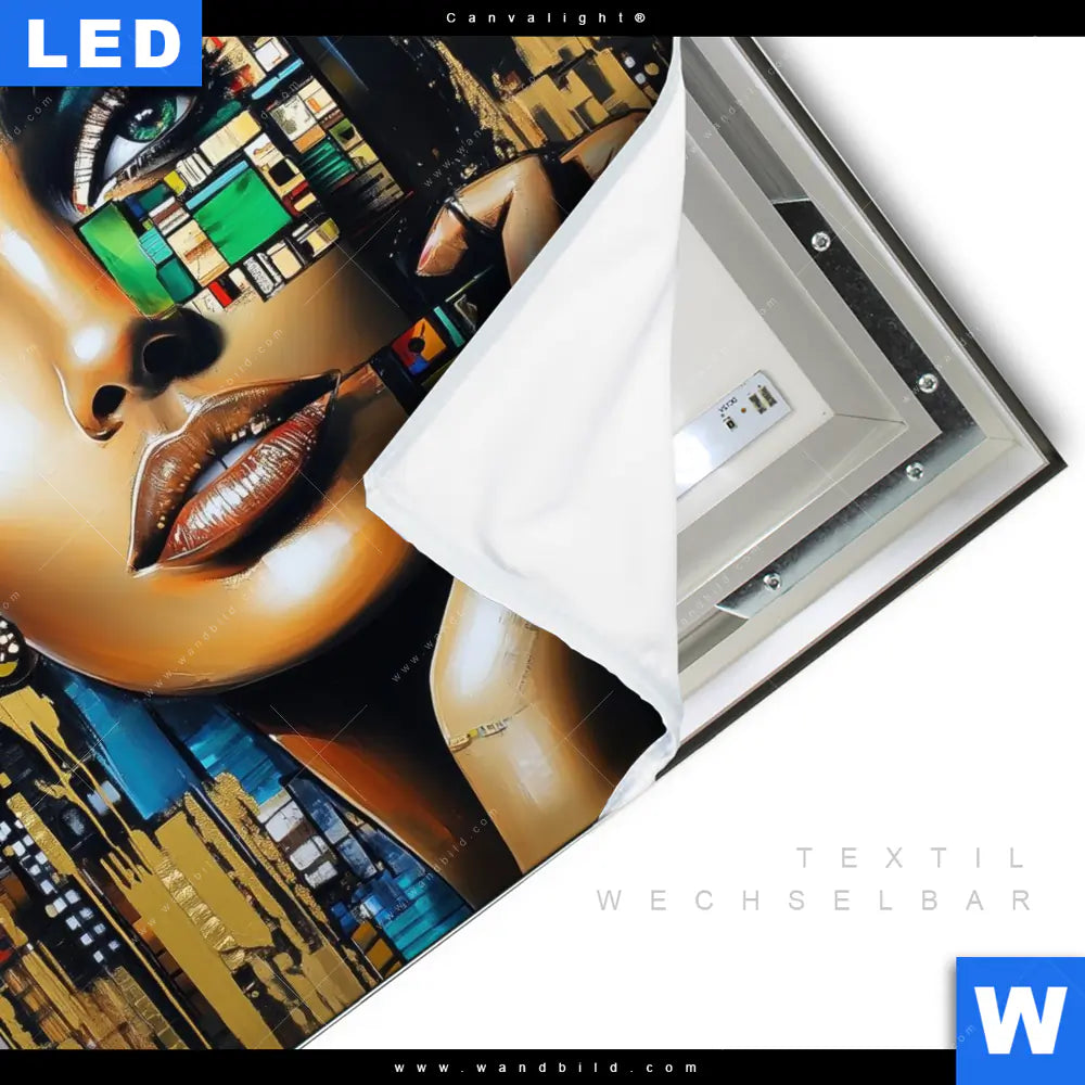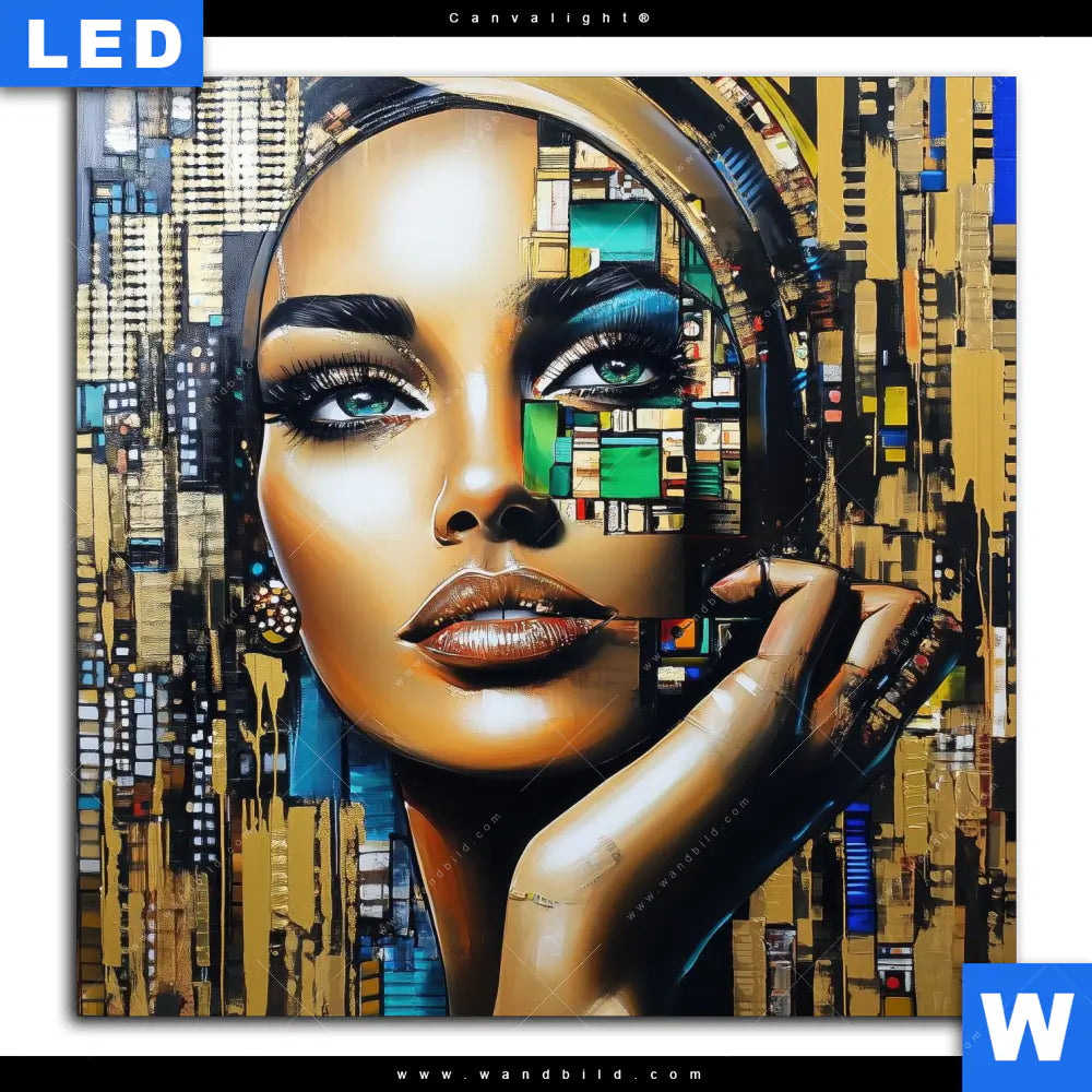 Canvalight® TEX Leuchtbild | Zoe - Mosaikgesicht im Großstadtlicht | Quadrat