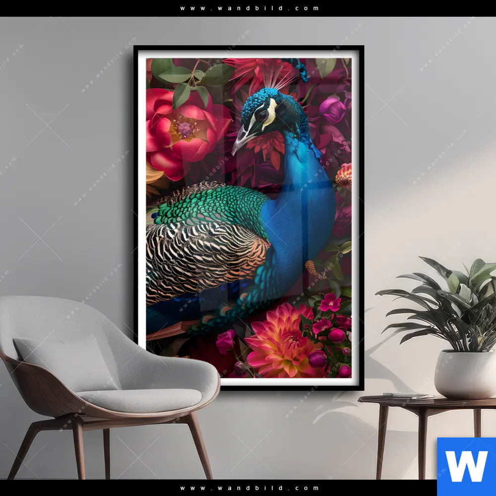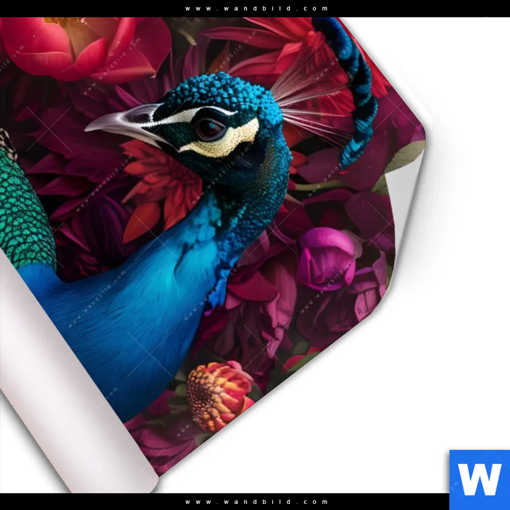 Poster | Prachtvoller Pfau und Blüten | Hochformat