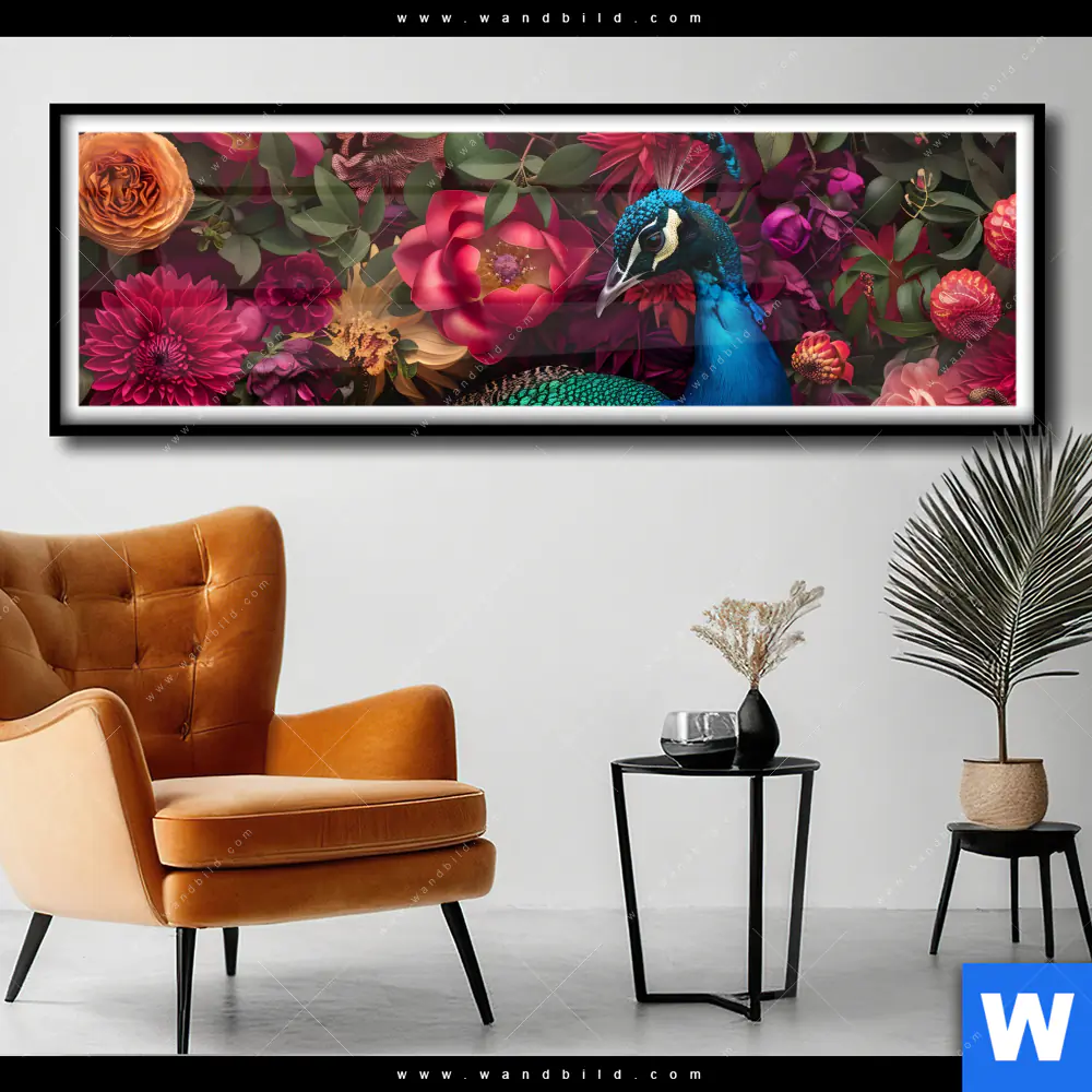 Poster | Prachtvoller Pfau und Blüten | Panorama
