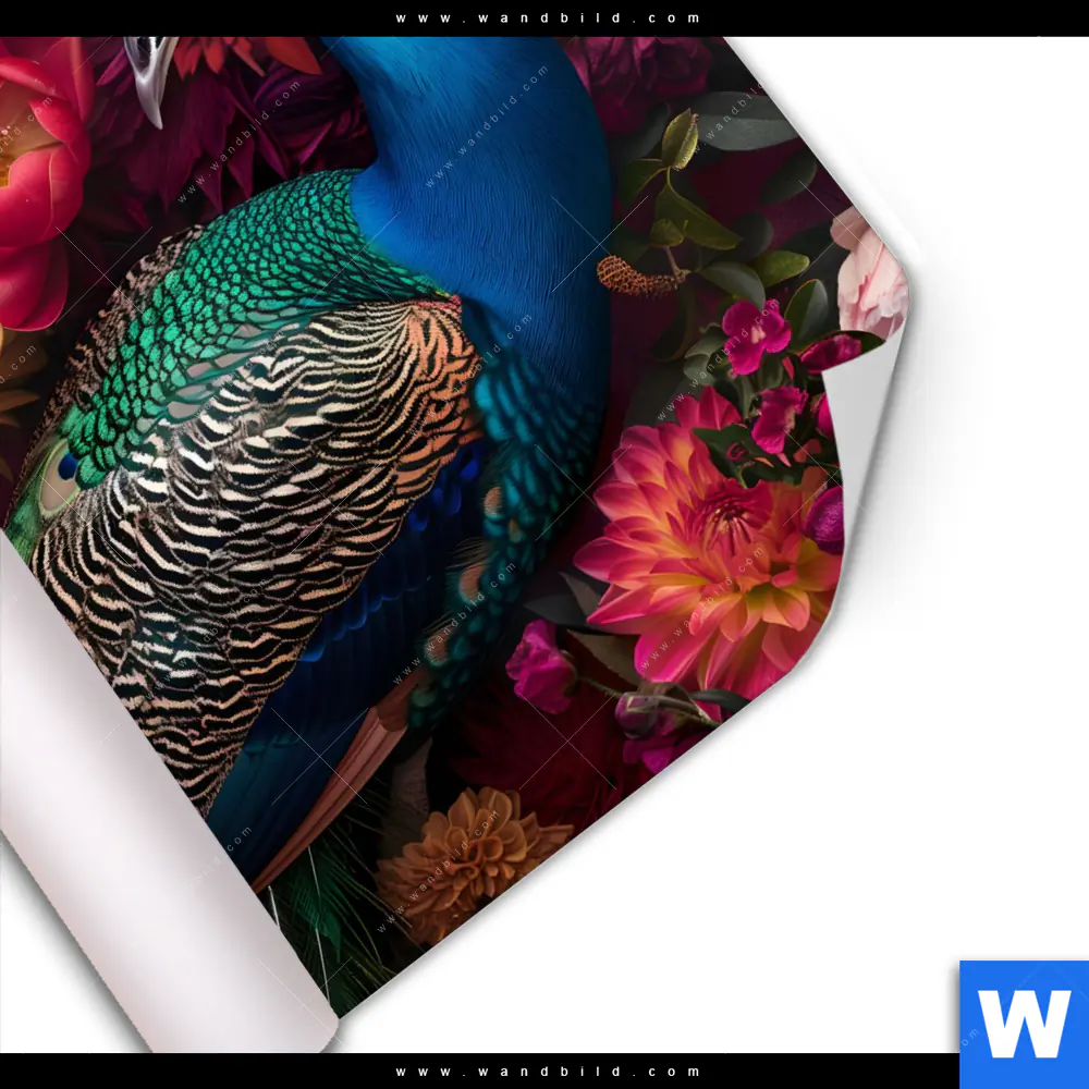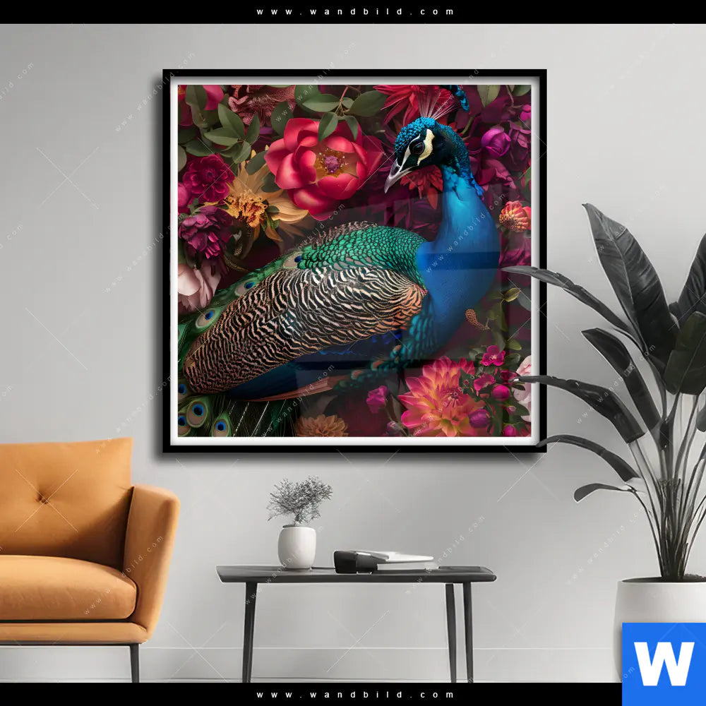 Poster | Prachtvoller Pfau und Blüten | Quadrat