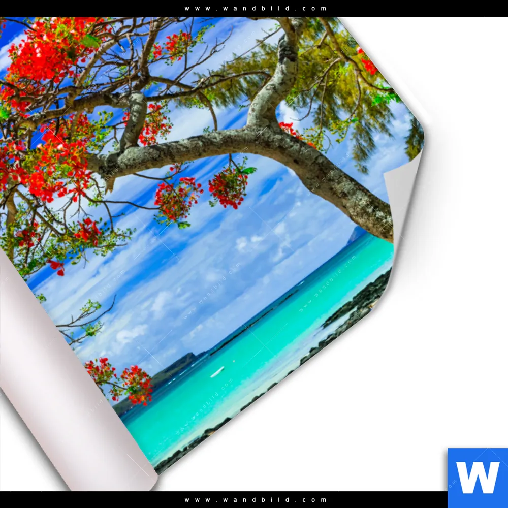 Poster | Rote Blüten und Türkisfarbenes Meer | Querformat