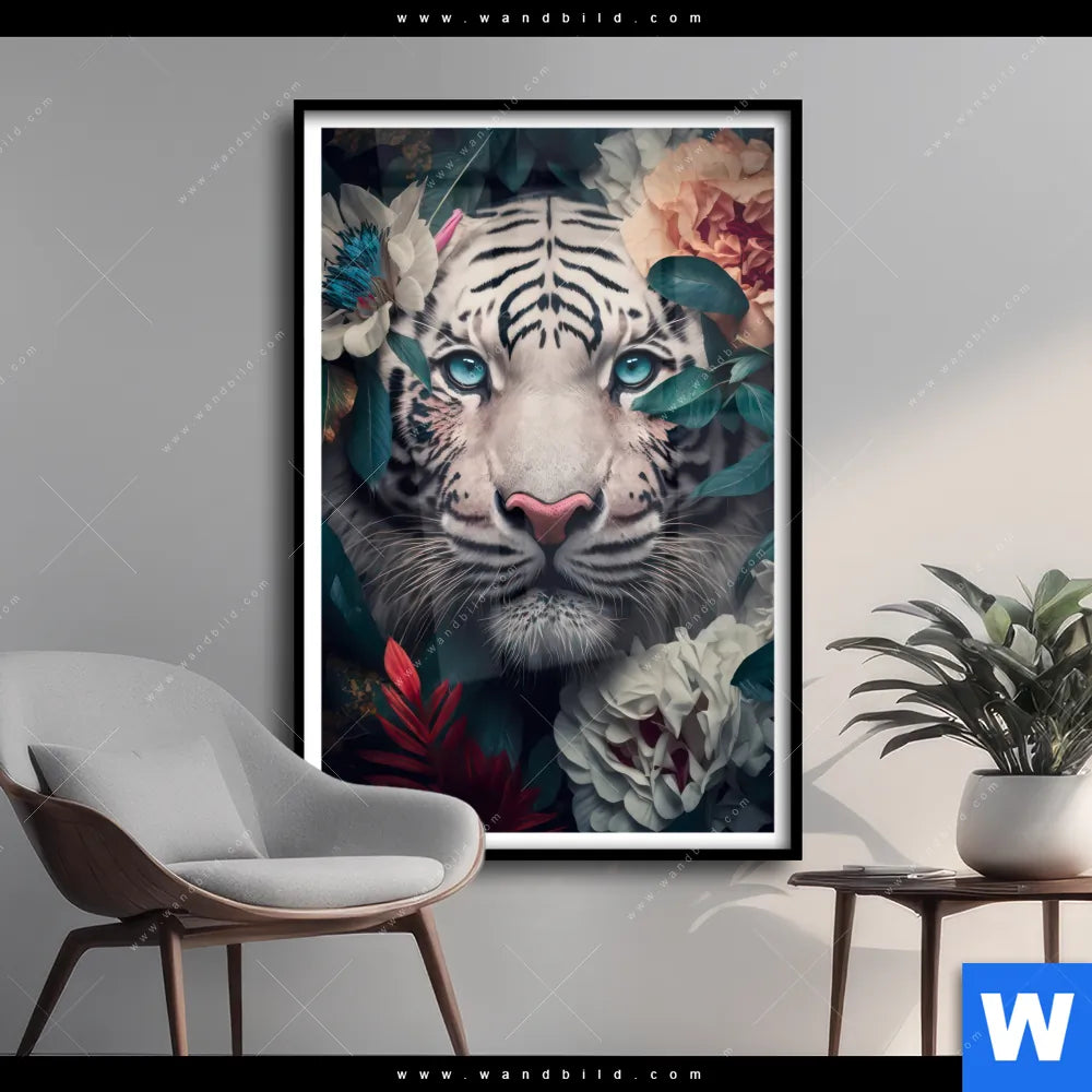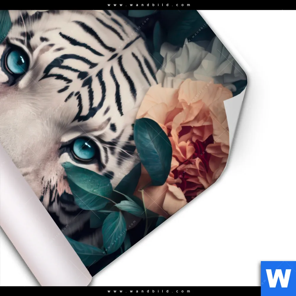 Poster | Weißer Tiger mit blauen Augen zwischen Blumen | Hochformat