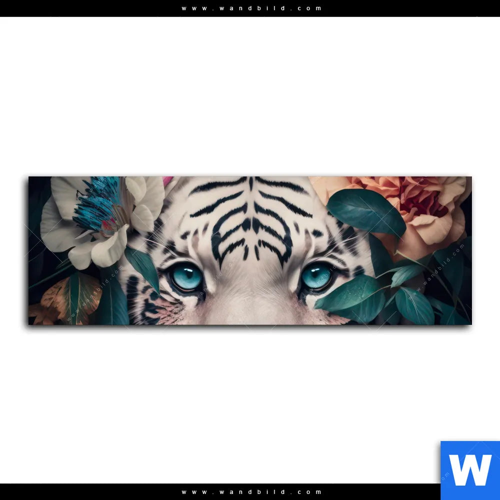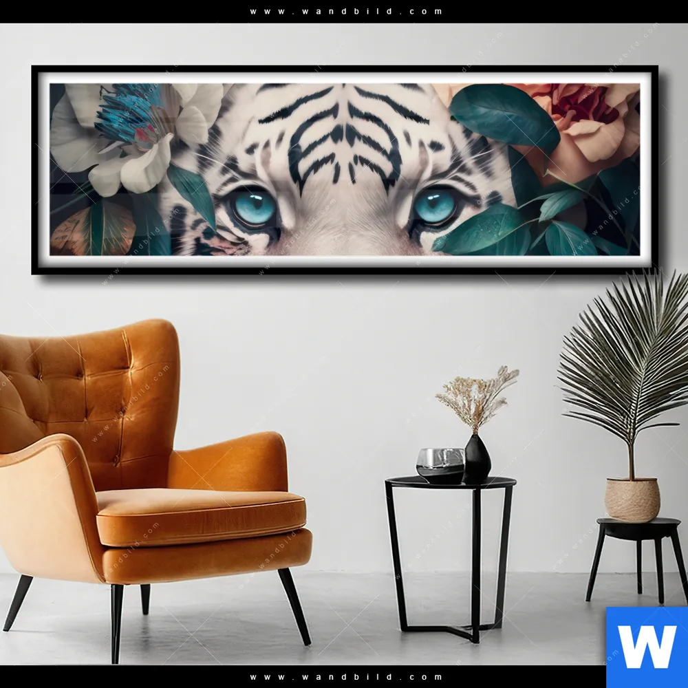 Poster | Weißer Tiger mit blauen Augen zwischen Blumen | Panorama