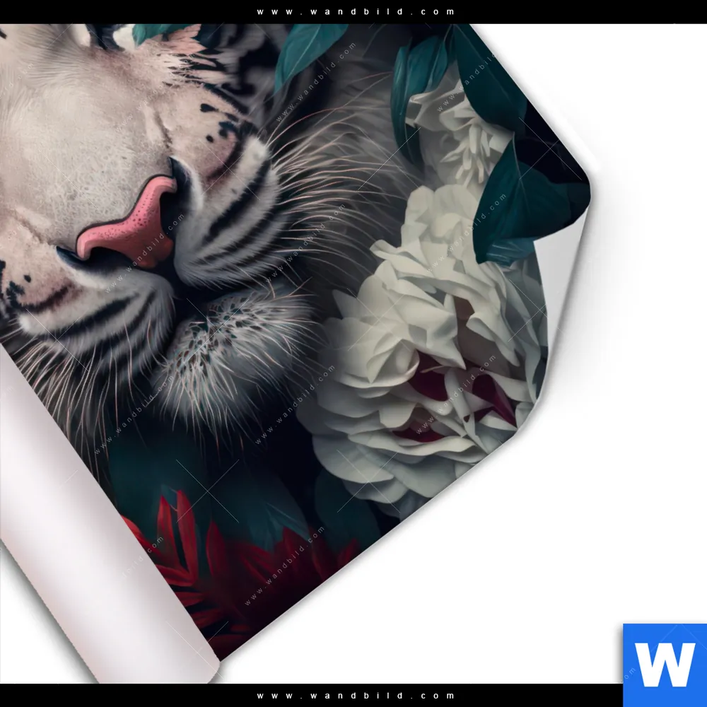 Poster | Weißer Tiger mit blauen Augen zwischen Blumen | Quadrat