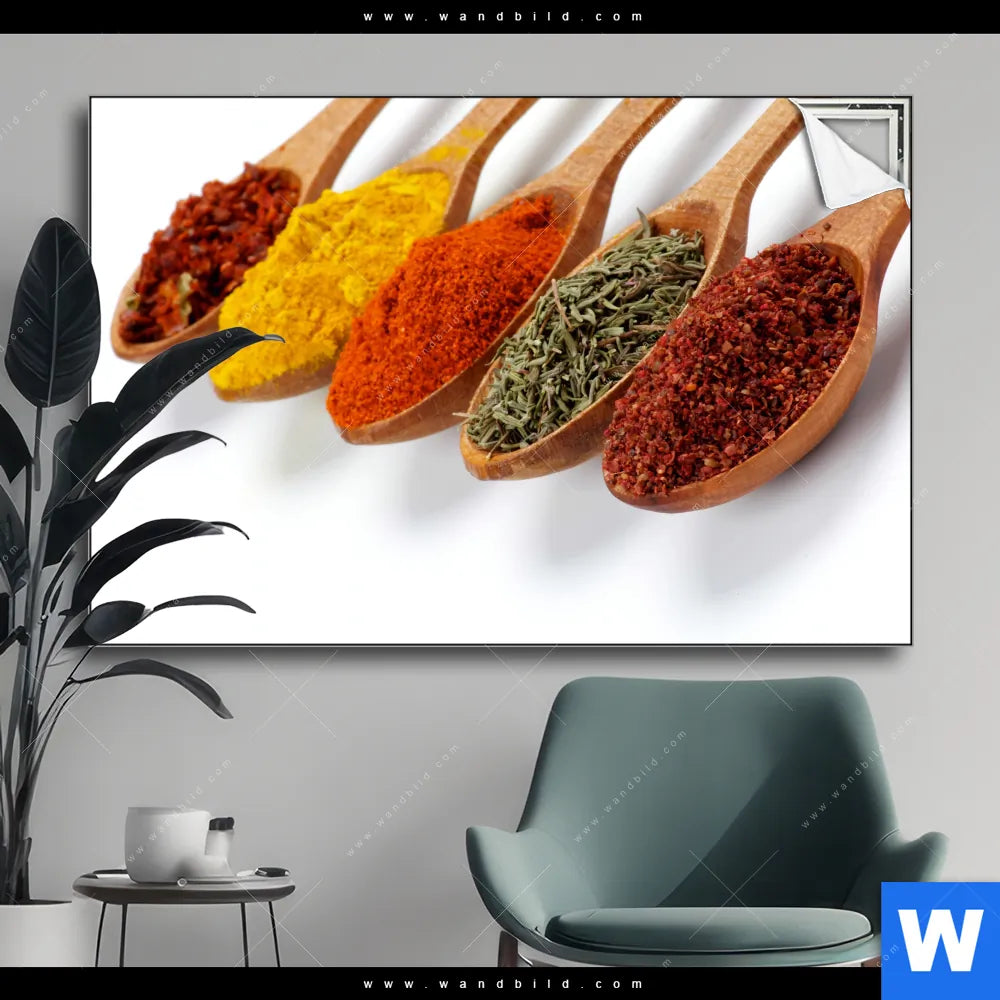Spannbild | Farbige Gewürze auf Holzlöffel | Querformat