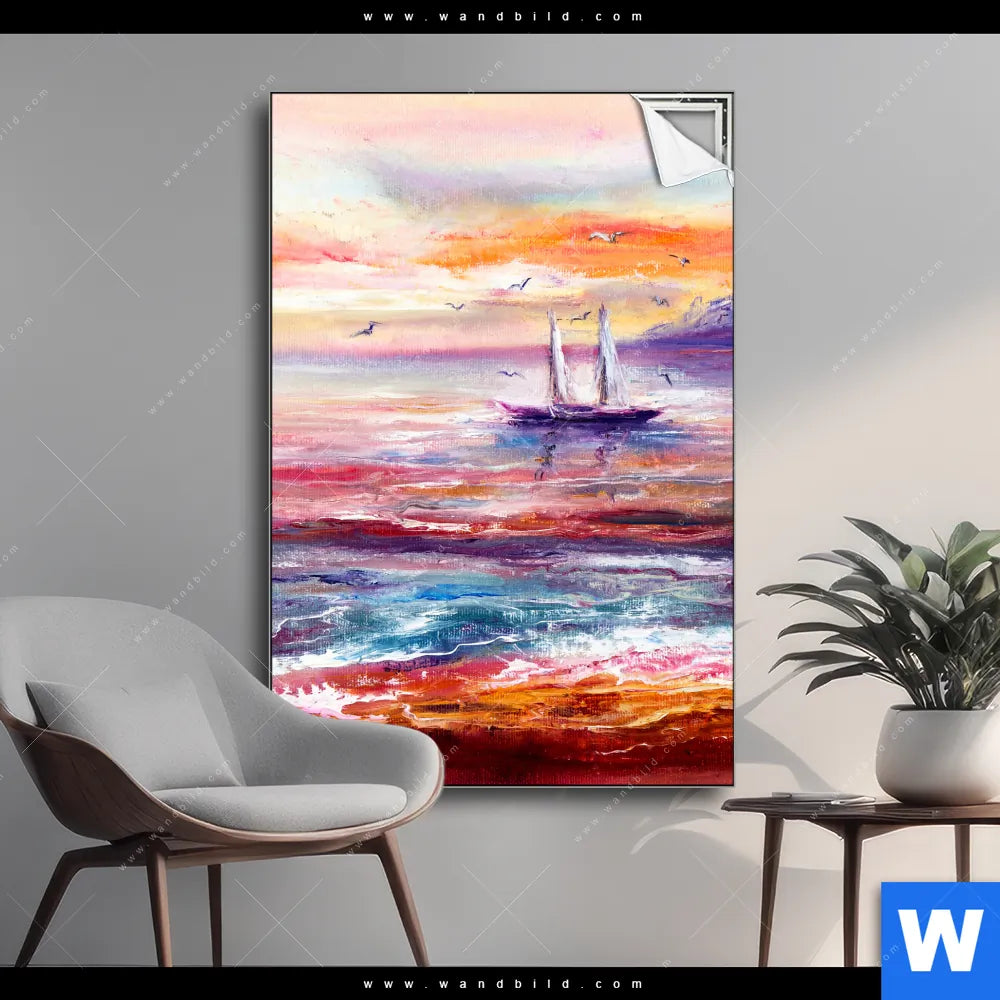 Spannbild | Gemälde mit Boot im Sonnenuntergang | Hochformat