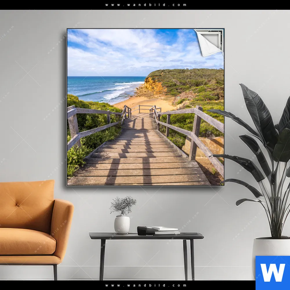 Spannbild | Holztreppe zum einsamen Strand | Quadrat