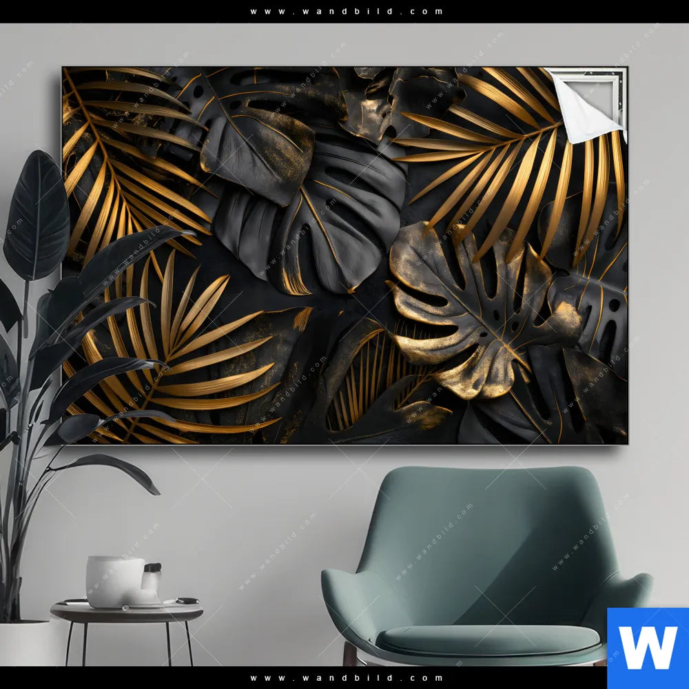 Spannbild | Palmenblätter Schwarz Gold | Querformat