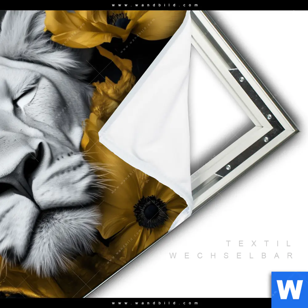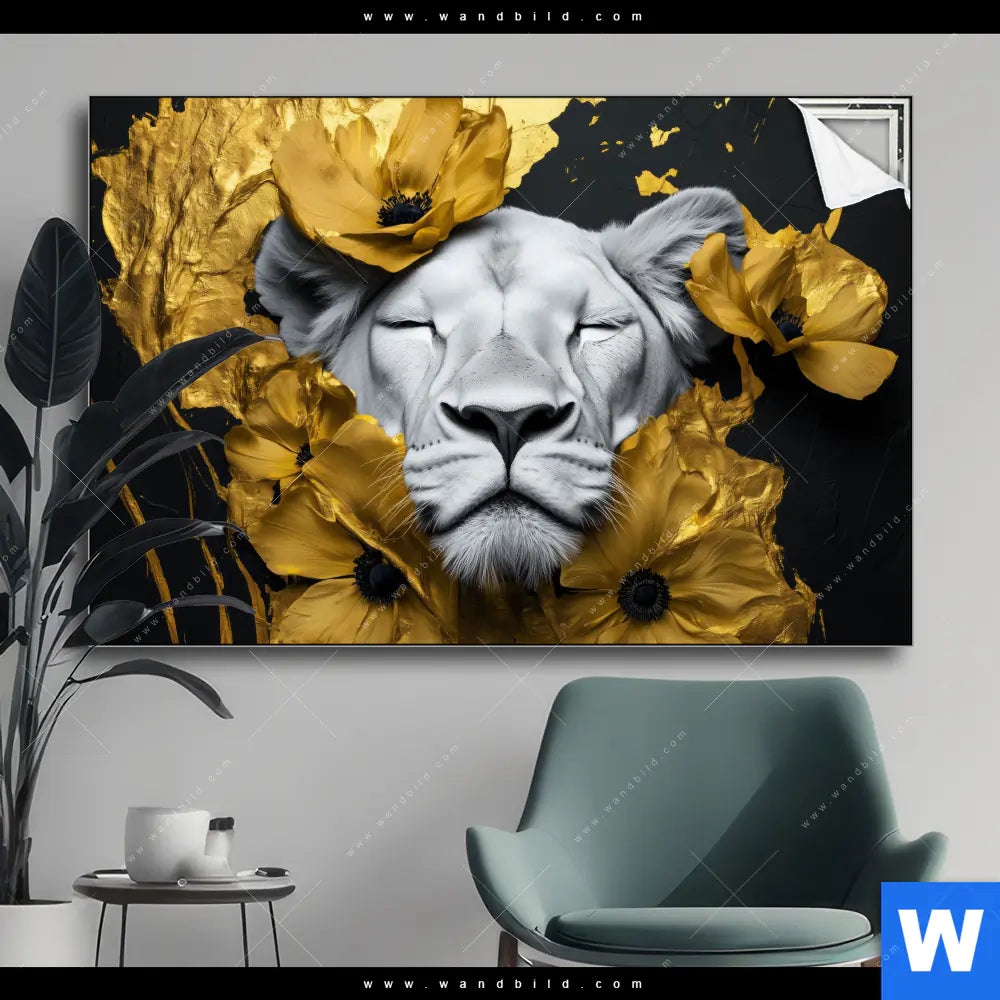 Spannbild | Weiße Löwin mit Goldblüten | Querformat
