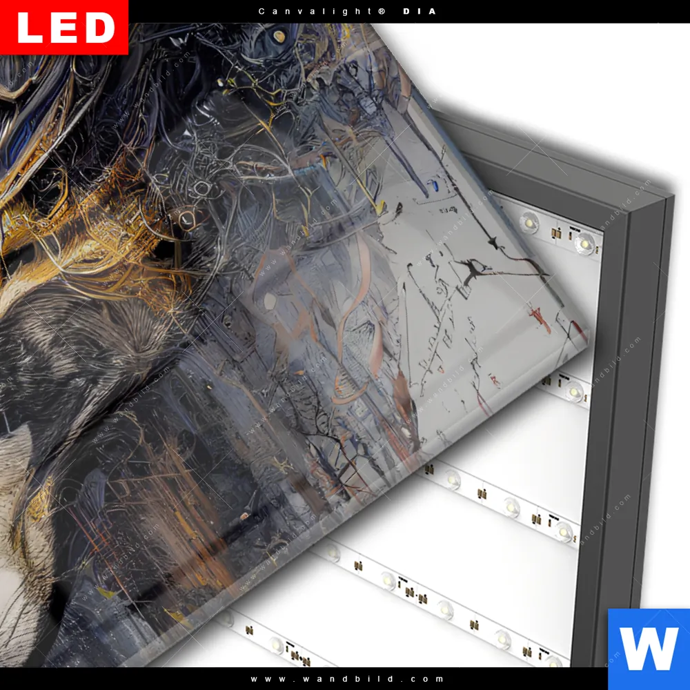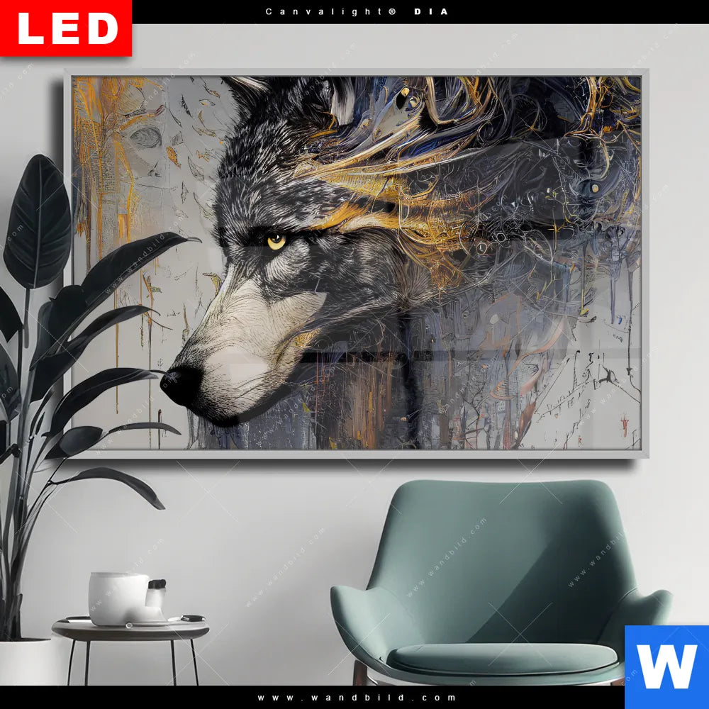 Wechselmotiv Acrylglas Canvalight® DIA | Abstrakter Wolf in Gold und Grau | Querformat