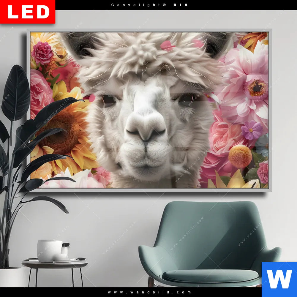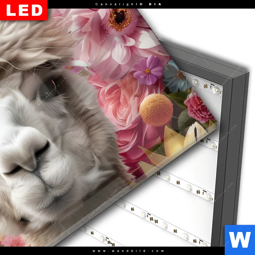 Wechselmotiv Acrylglas Canvalight® DIA | Alpaka mit Blumen | Querformat