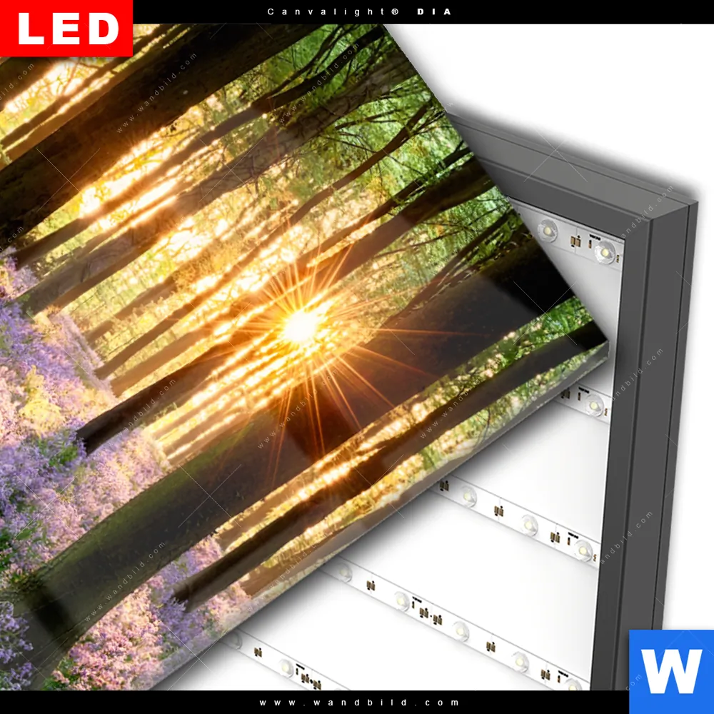 Wechselmotiv Acrylglas Canvalight® DIA | Blühender Wald bei Sonnenaufgang | Hochformat