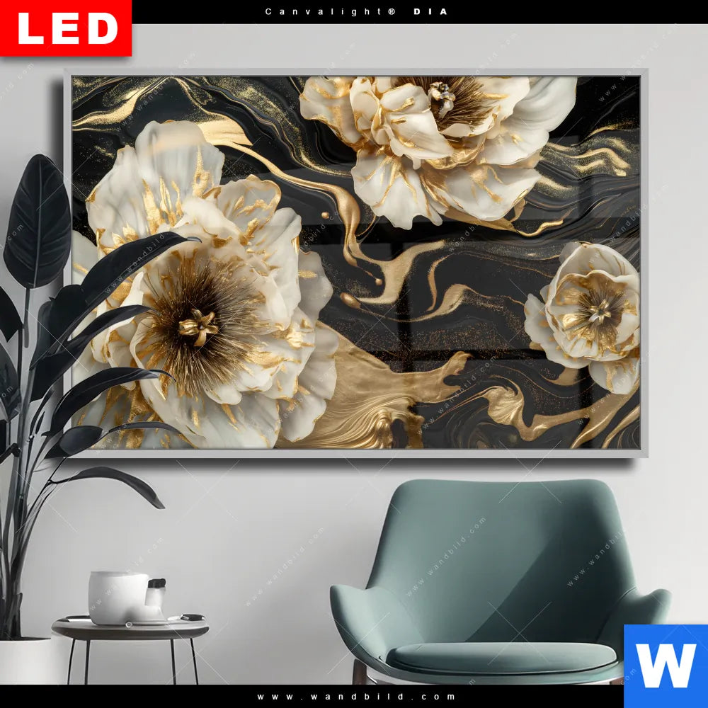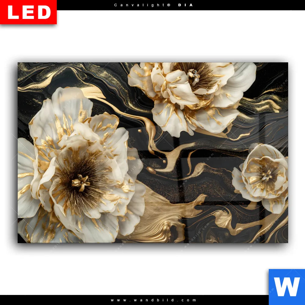 Wechselmotiv Acrylglas Canvalight® DIA | Blüten Gold Weiß Schwarz | Querformat