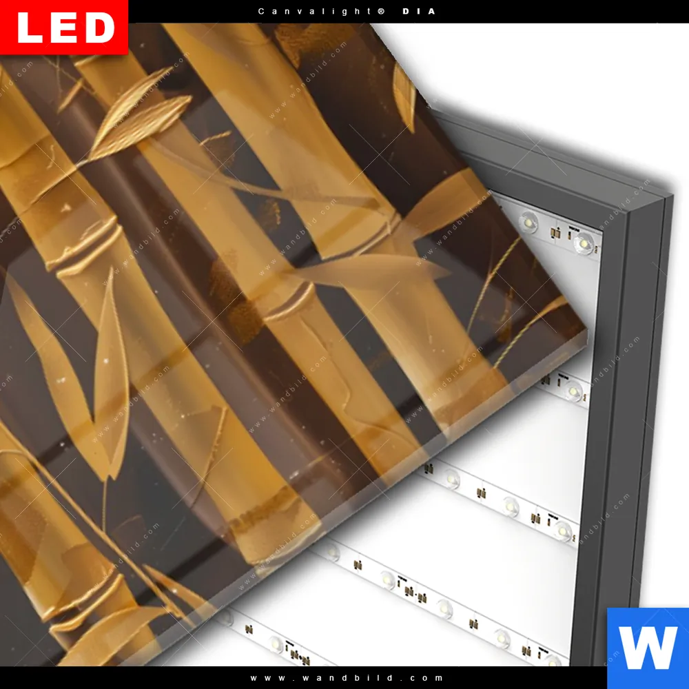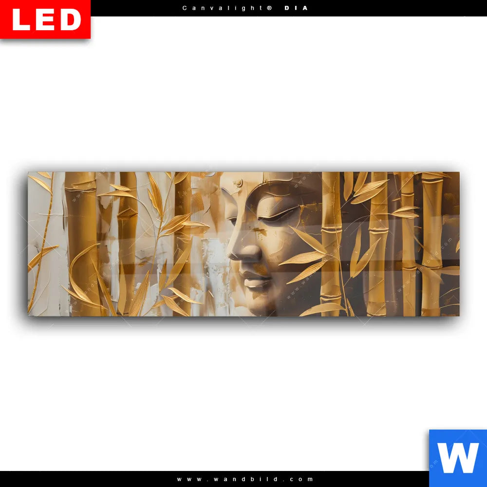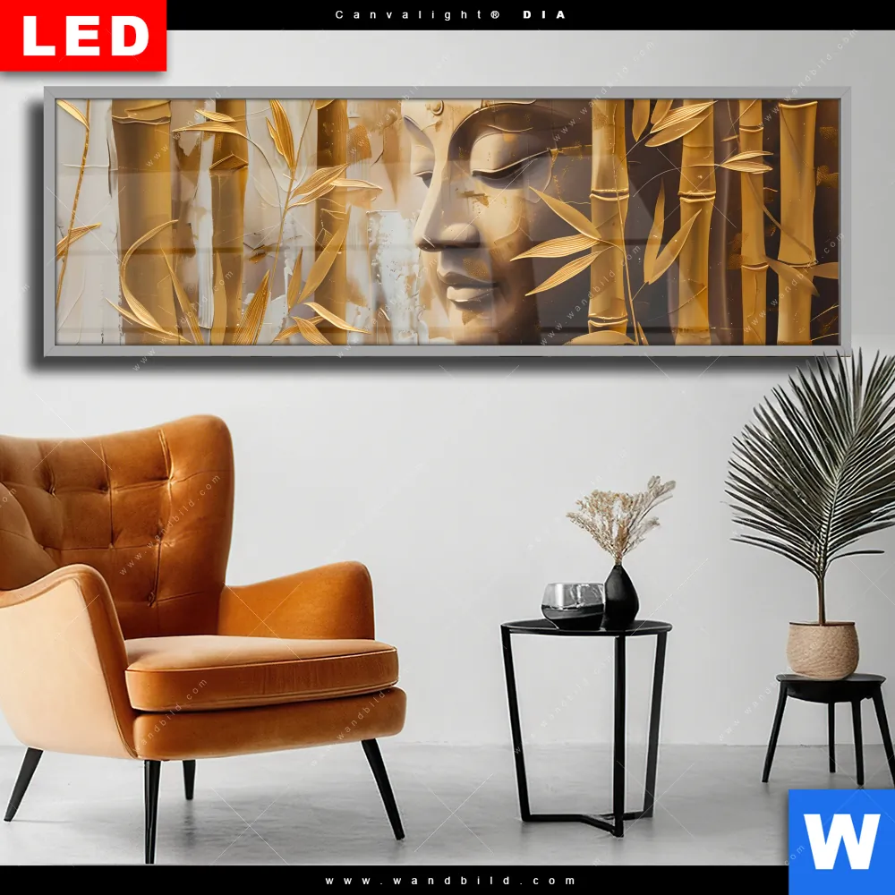 Wechselmotiv Acrylglas Canvalight® DIA | Buddha-Statue im goldenen Bambus | Panorama
