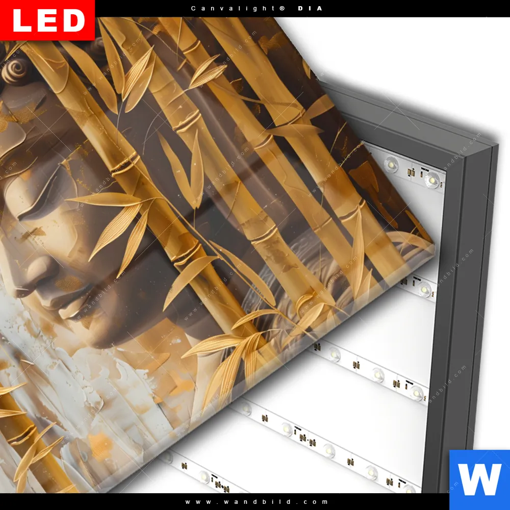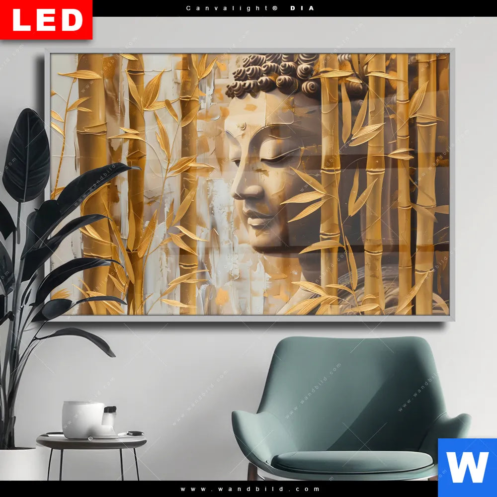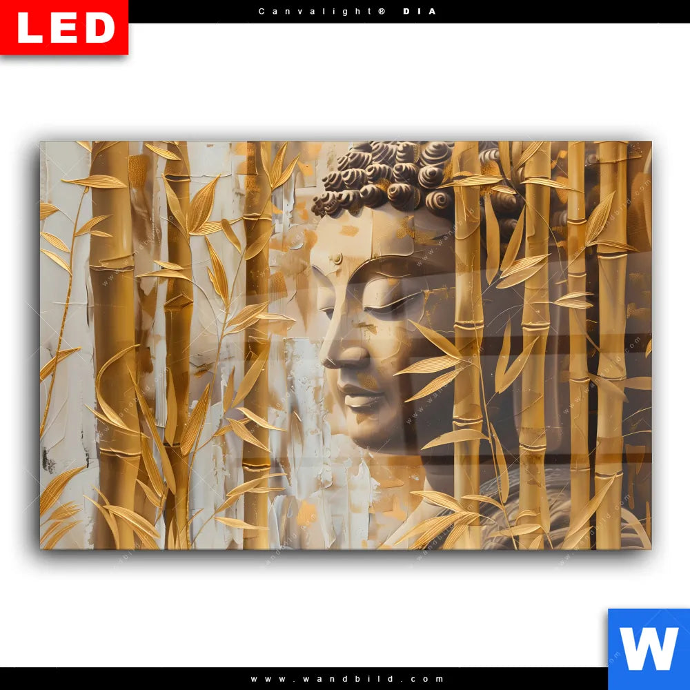 Wechselmotiv Acrylglas Canvalight® DIA | Buddha-Statue im goldenen Bambus | Querformat