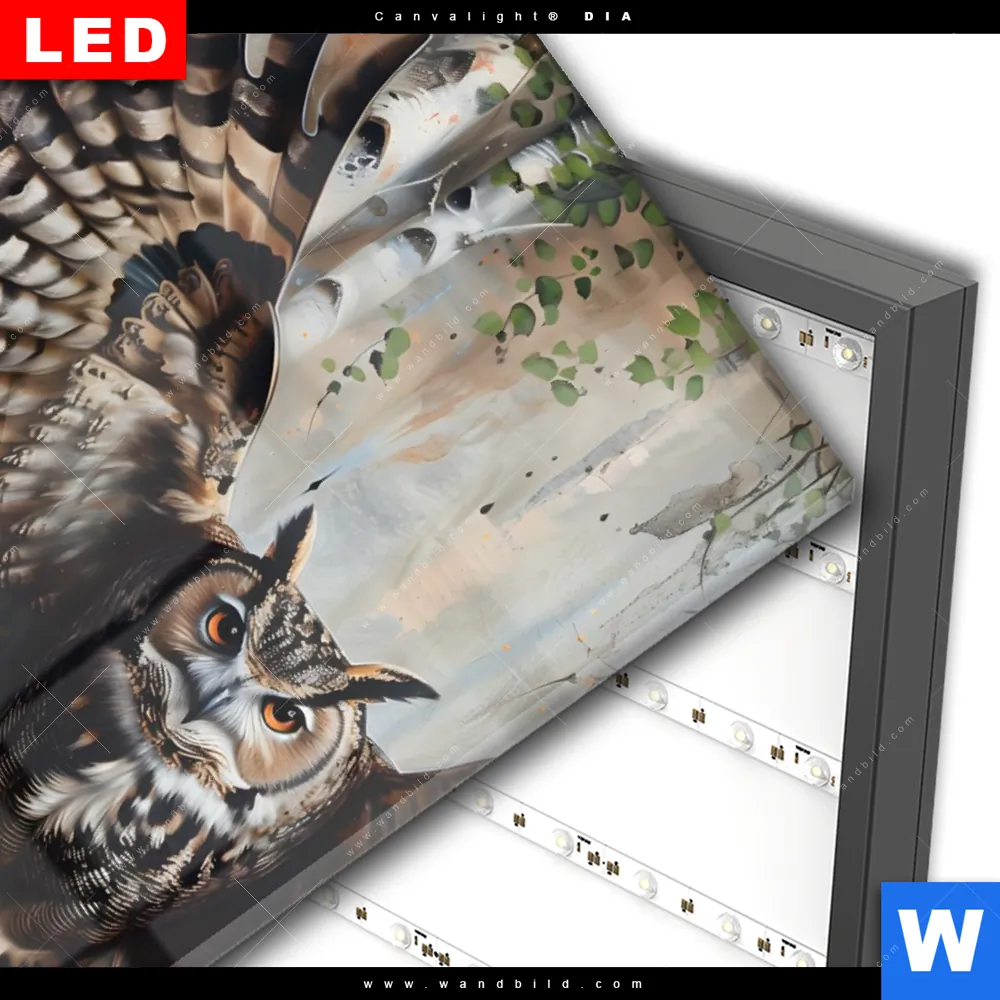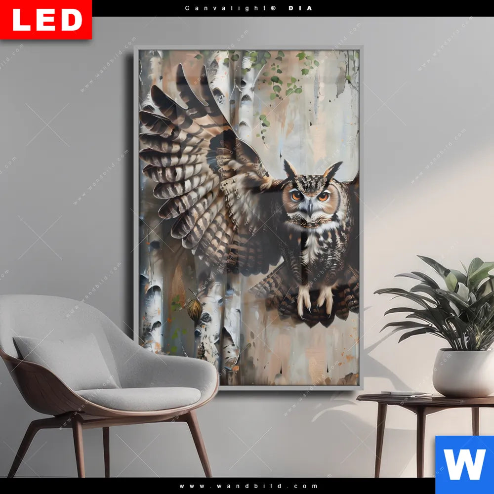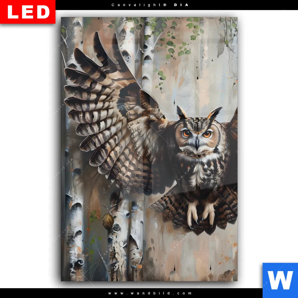 Wechselmotiv Acrylglas Canvalight® DIA | Eule im Birkenwald | Hochformat