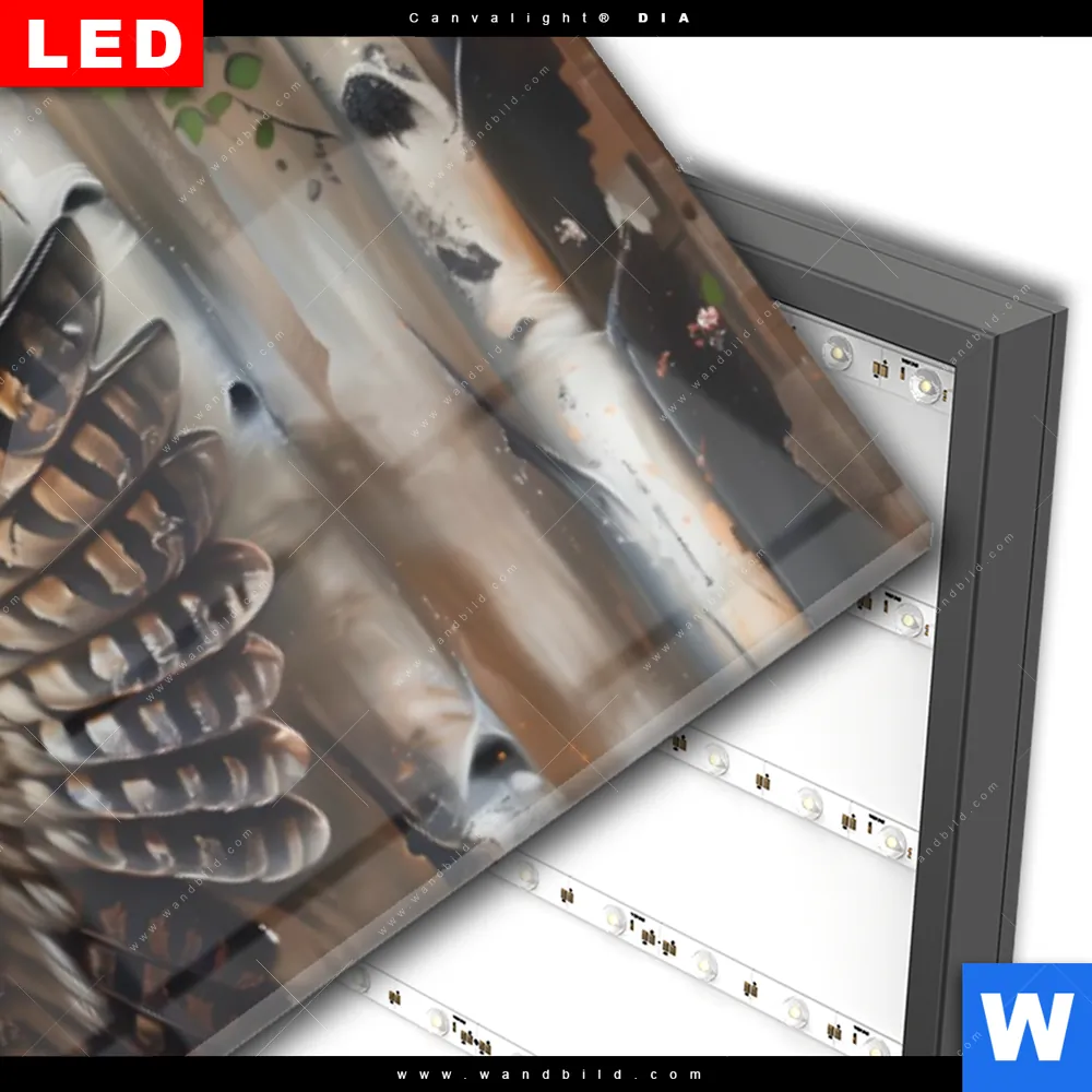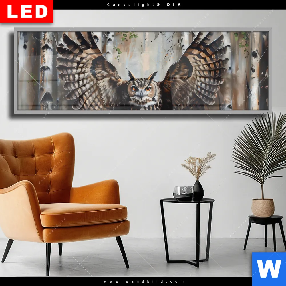 Wechselmotiv Acrylglas Canvalight® DIA | Eule im Birkenwald | Panorama
