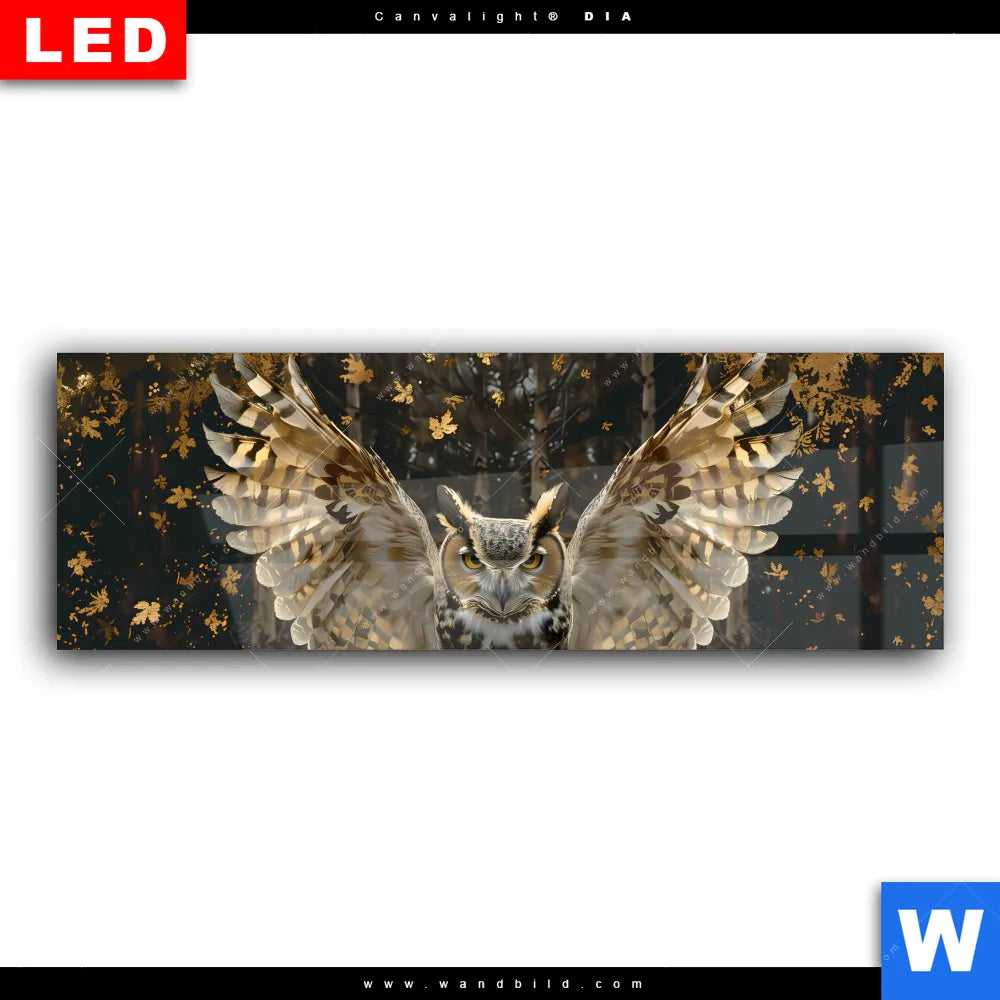 Wechselmotiv Acrylglas Canvalight® DIA | Eule inmitten goldener Blätter | Panorama