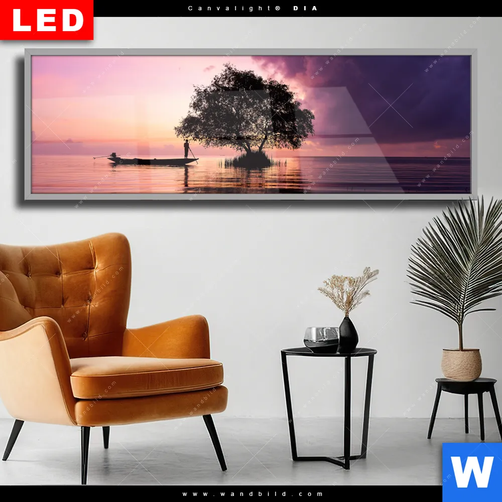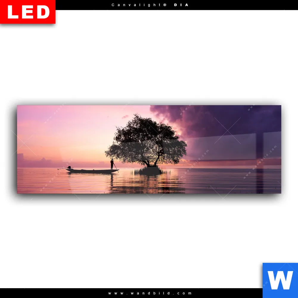 Wechselmotiv Acrylglas Canvalight® DIA | Fischer auf Boot Sonnenaufgang | Panorama