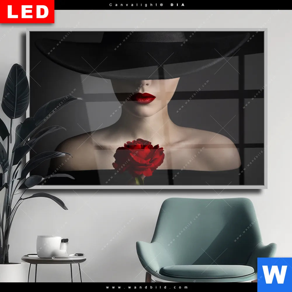 Wechselmotiv Acrylglas Canvalight® DIA | Frau mit Hut & Rose | Querformat