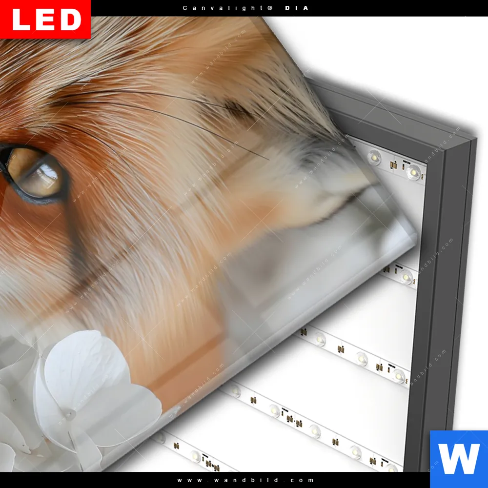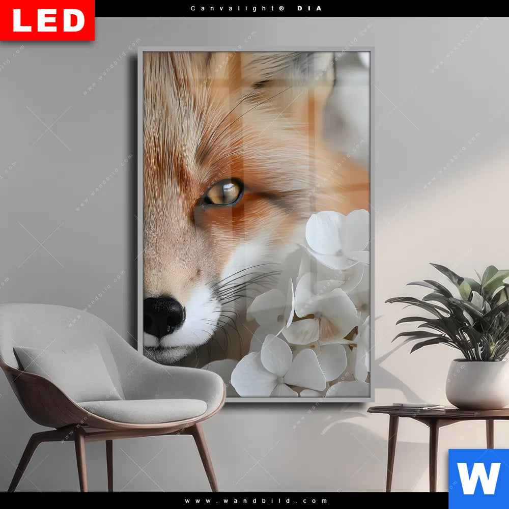 Wechselmotiv Acrylglas Canvalight® DIA | Friedlicher Fuchs und Blumen | Hochformat