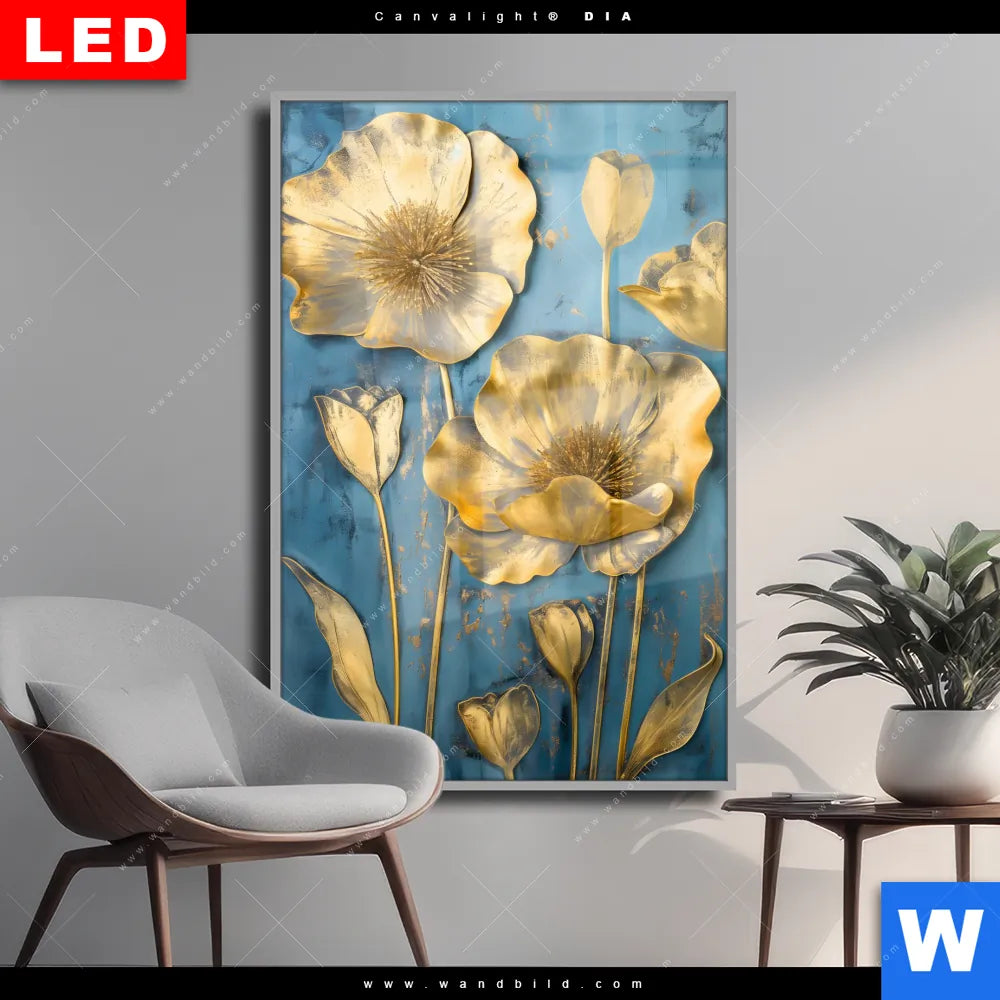 Wechselmotiv Acrylglas Canvalight® DIA | Goldene Blumen auf Blau | Hochformat