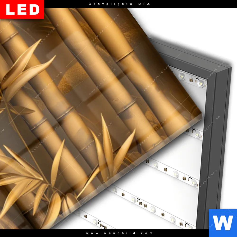 Wechselmotiv Acrylglas Canvalight® DIA | Goldener Buddha im Bambuswald | Panorama