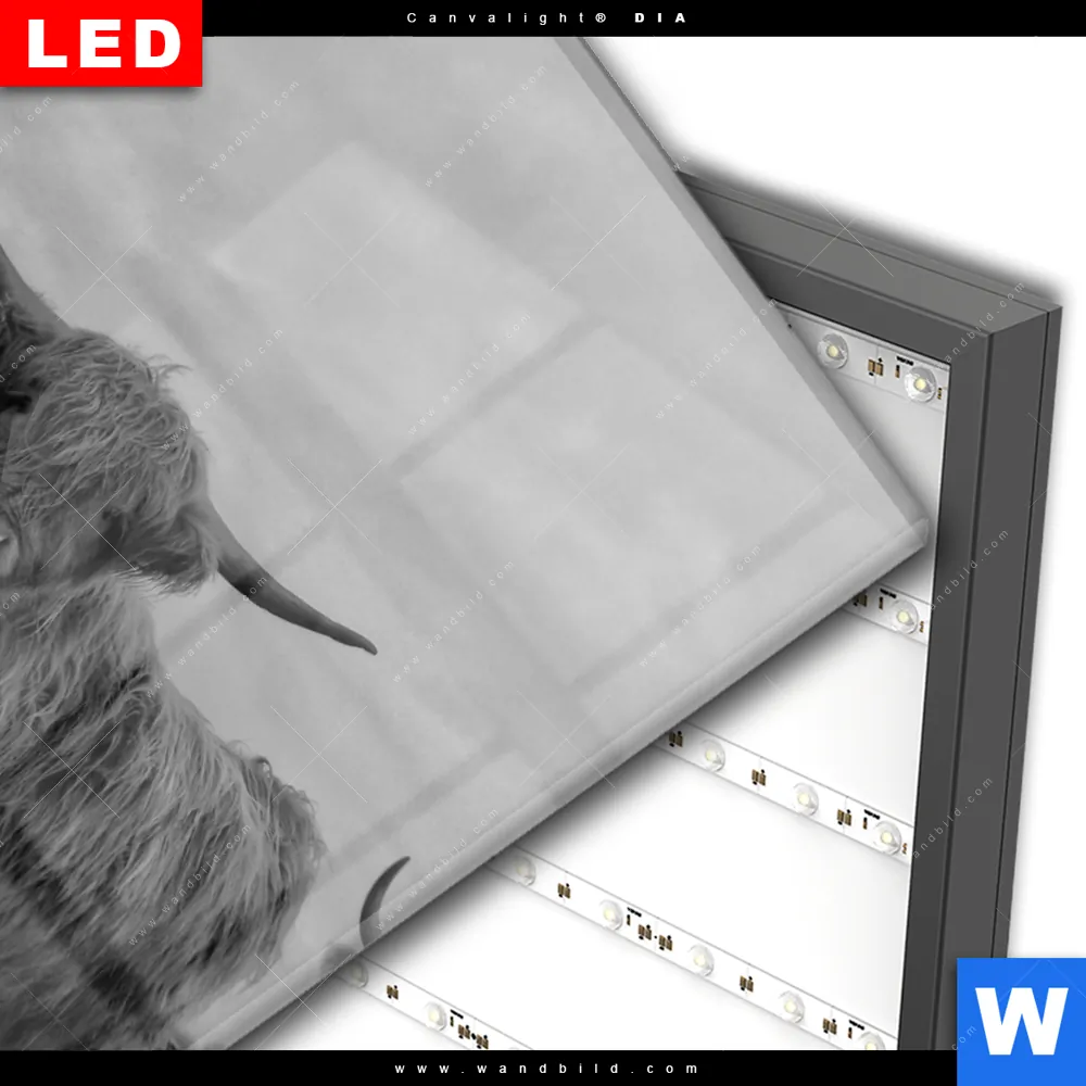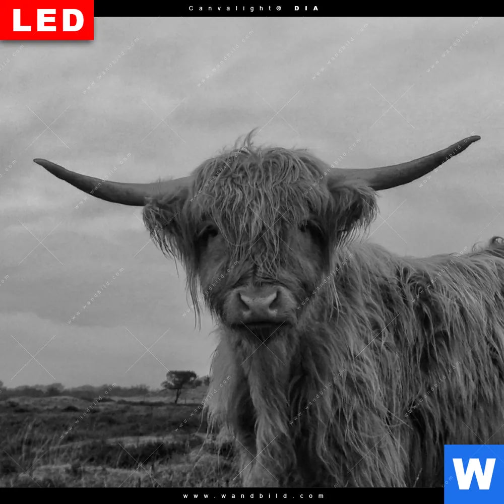Wechselmotiv Acrylglas Canvalight® DIA | Hochland-Rind Schwarz-Weiß | Hochformat