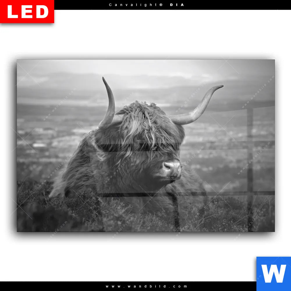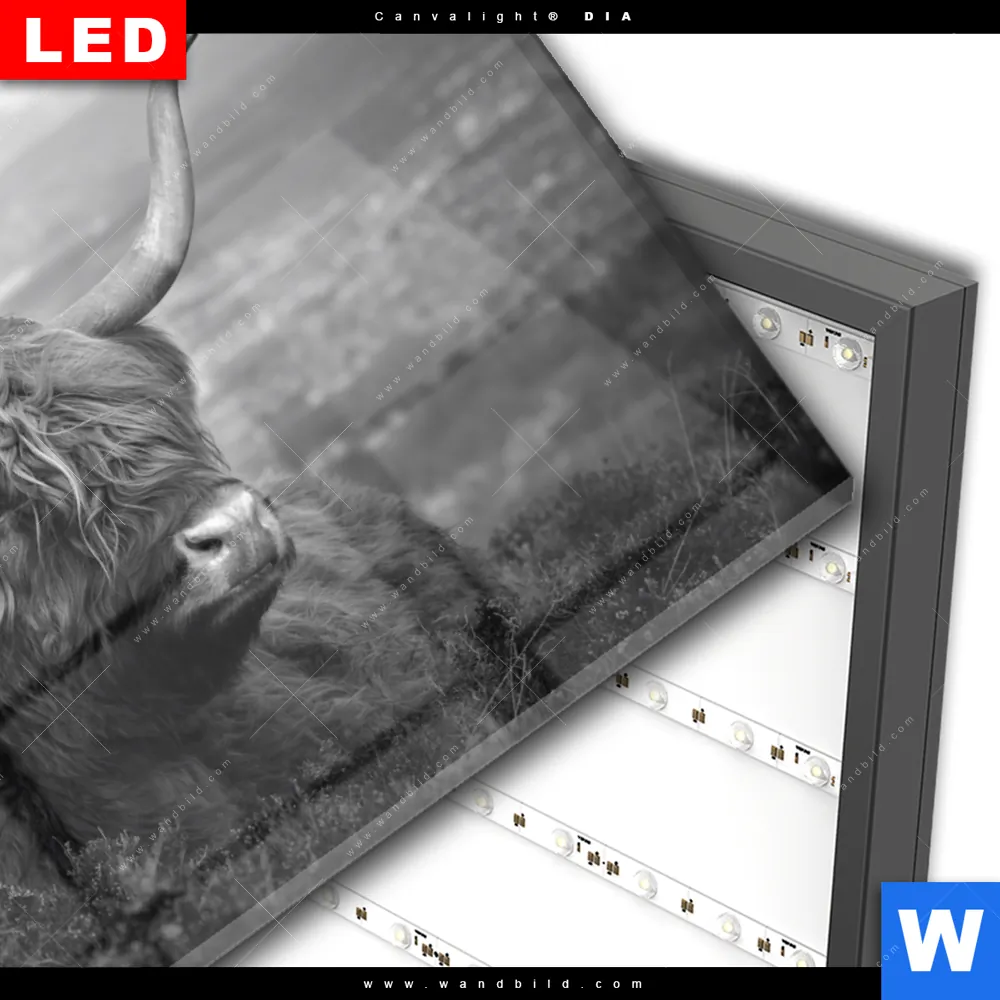 Wechselmotiv Acrylglas Canvalight® DIA | Hochland-Rind Schwarz-Weiß No. 2 | Querformat