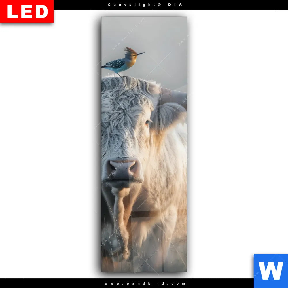 Wechselmotiv Acrylglas Canvalight® DIA | Hochlandrind & bunter Vogel | Schmal