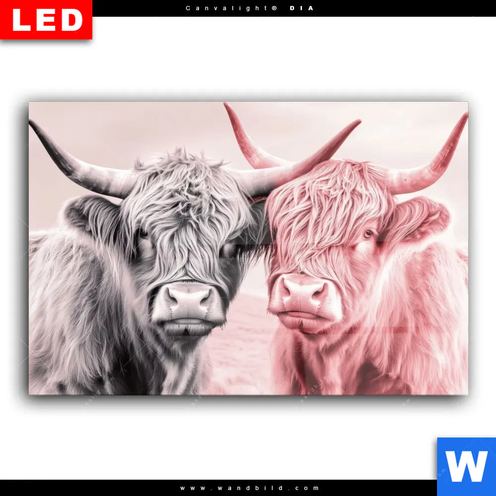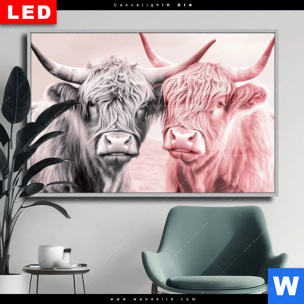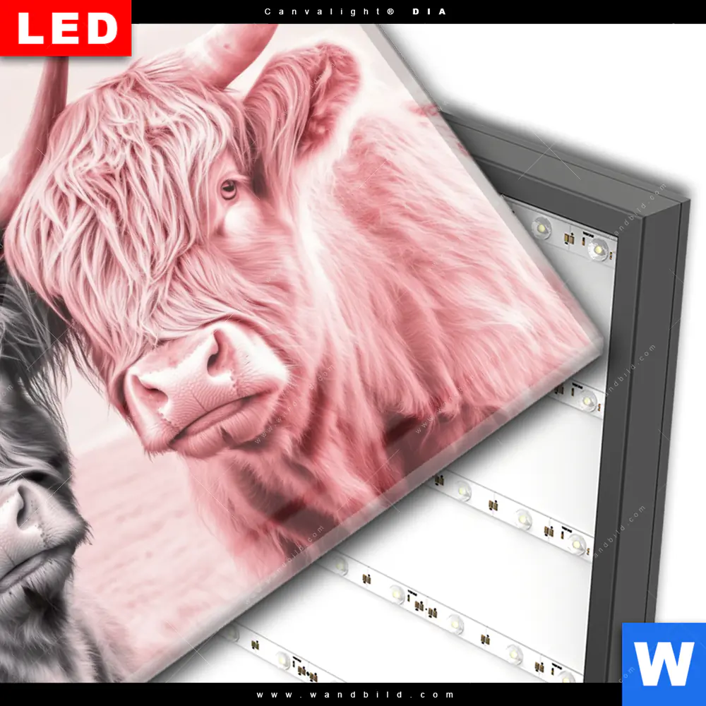Wechselmotiv Acrylglas Canvalight® DIA | Hochlandrinder - Harmonie in Pastell | Querformat