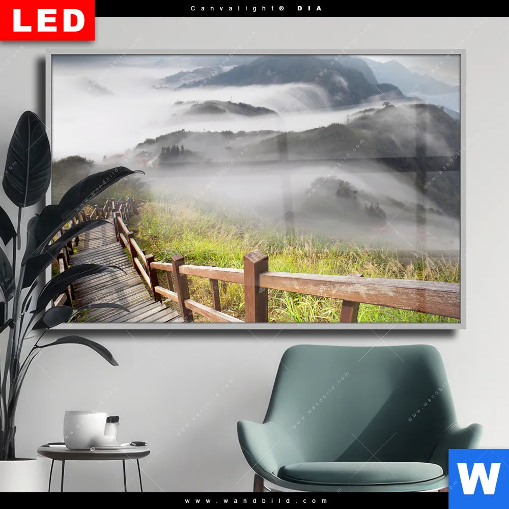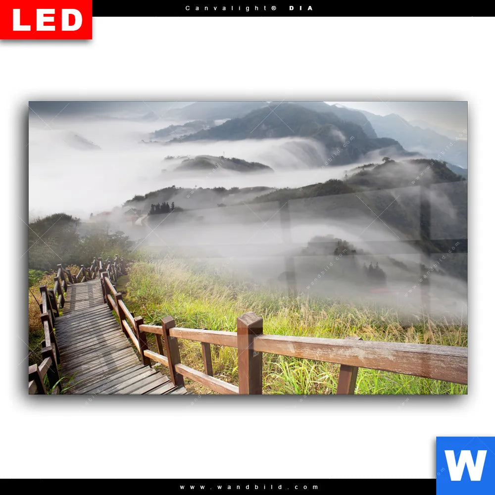 Wechselmotiv Acrylglas Canvalight® DIA | Holztreppe auf Berg mit Wolken | Querformat