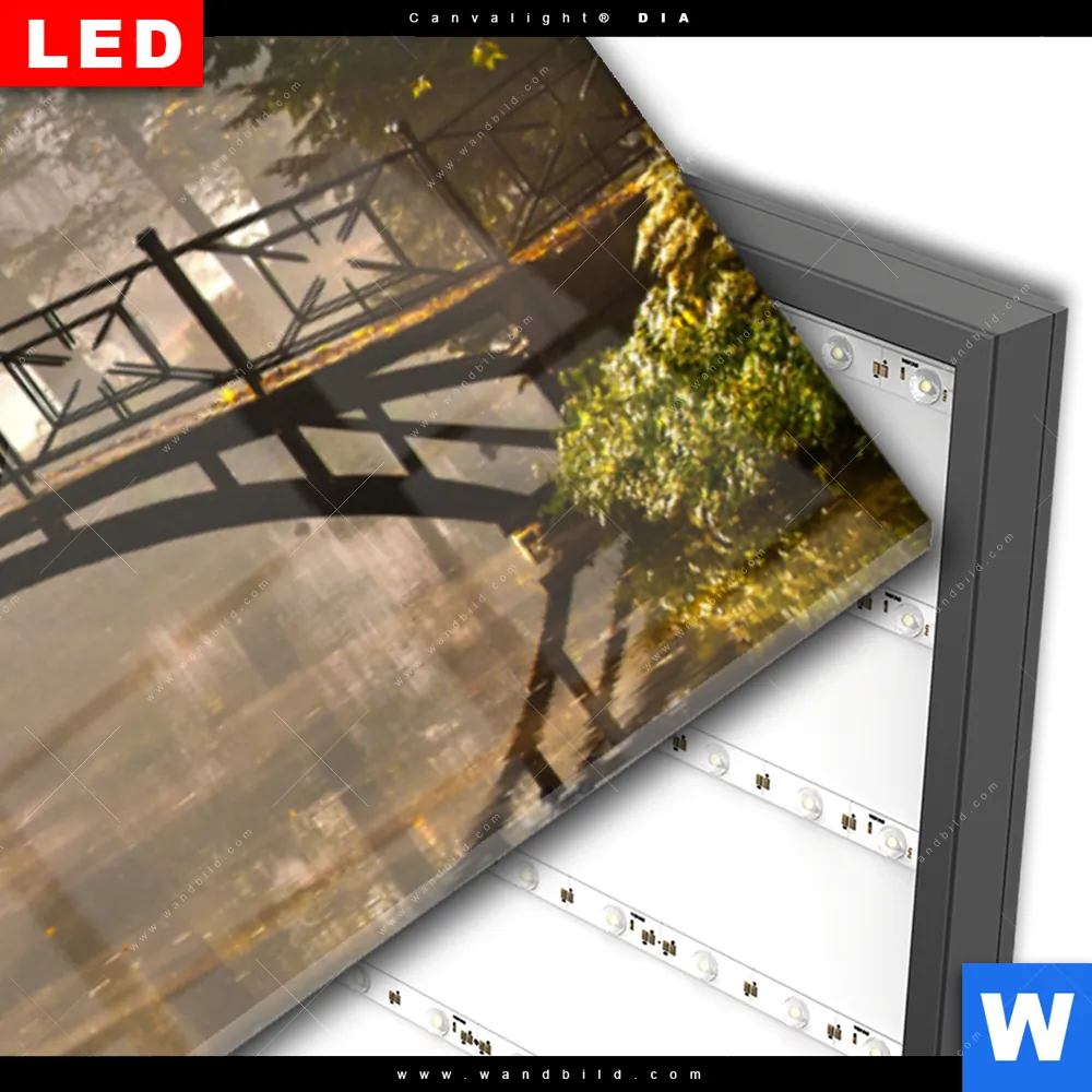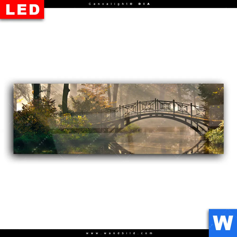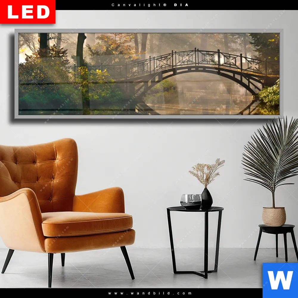 Wechselmotiv Acrylglas Canvalight® DIA | Idyllischer Wald mit Brücke | Panorama