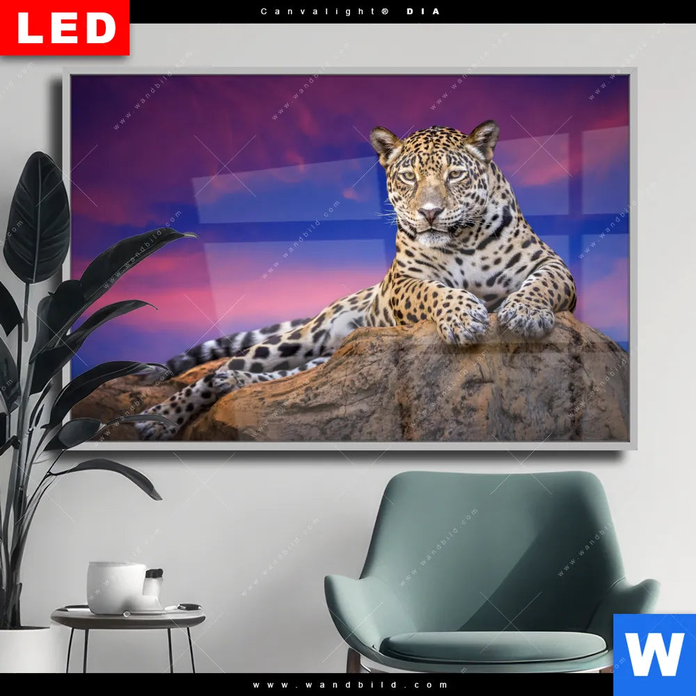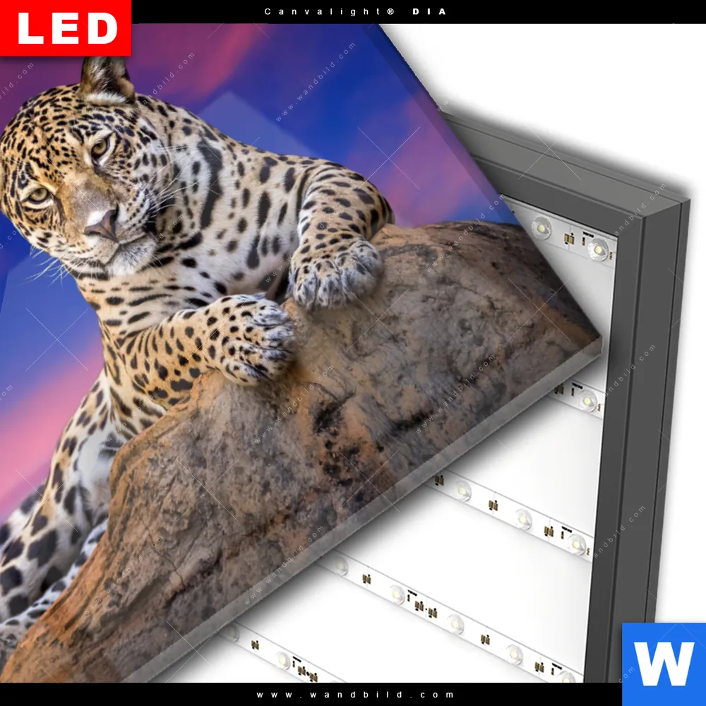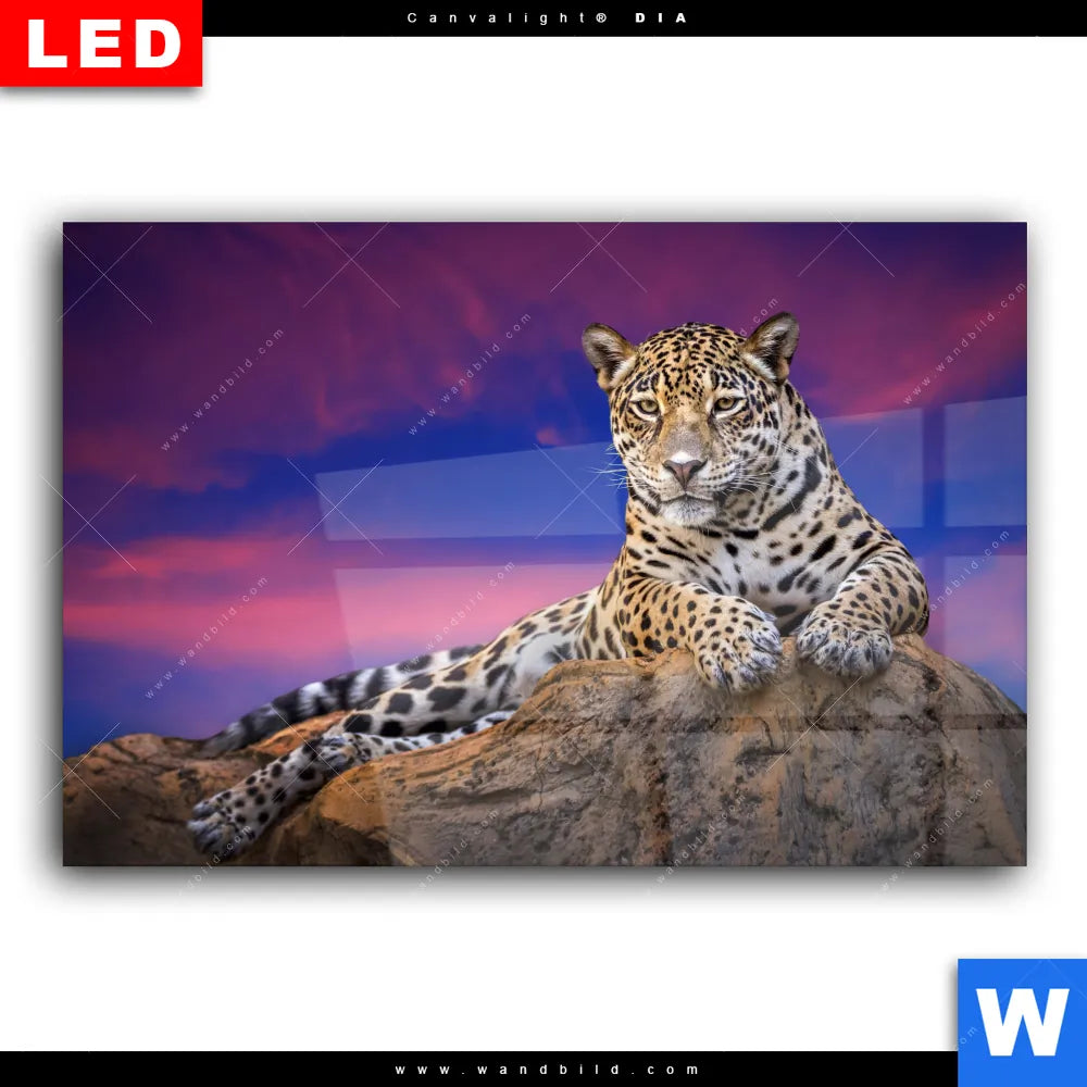 Wechselmotiv Acrylglas Canvalight® DIA | Jaguar auf Felsen | Querformat