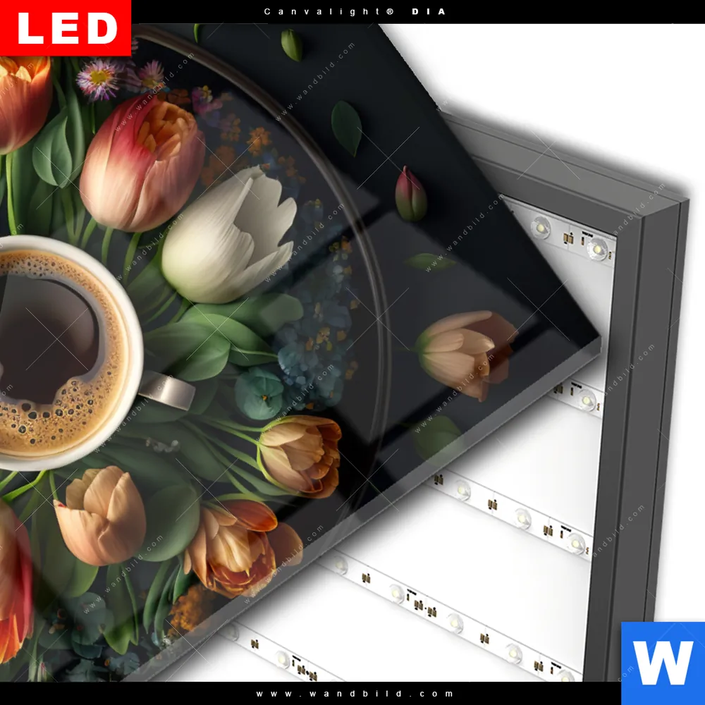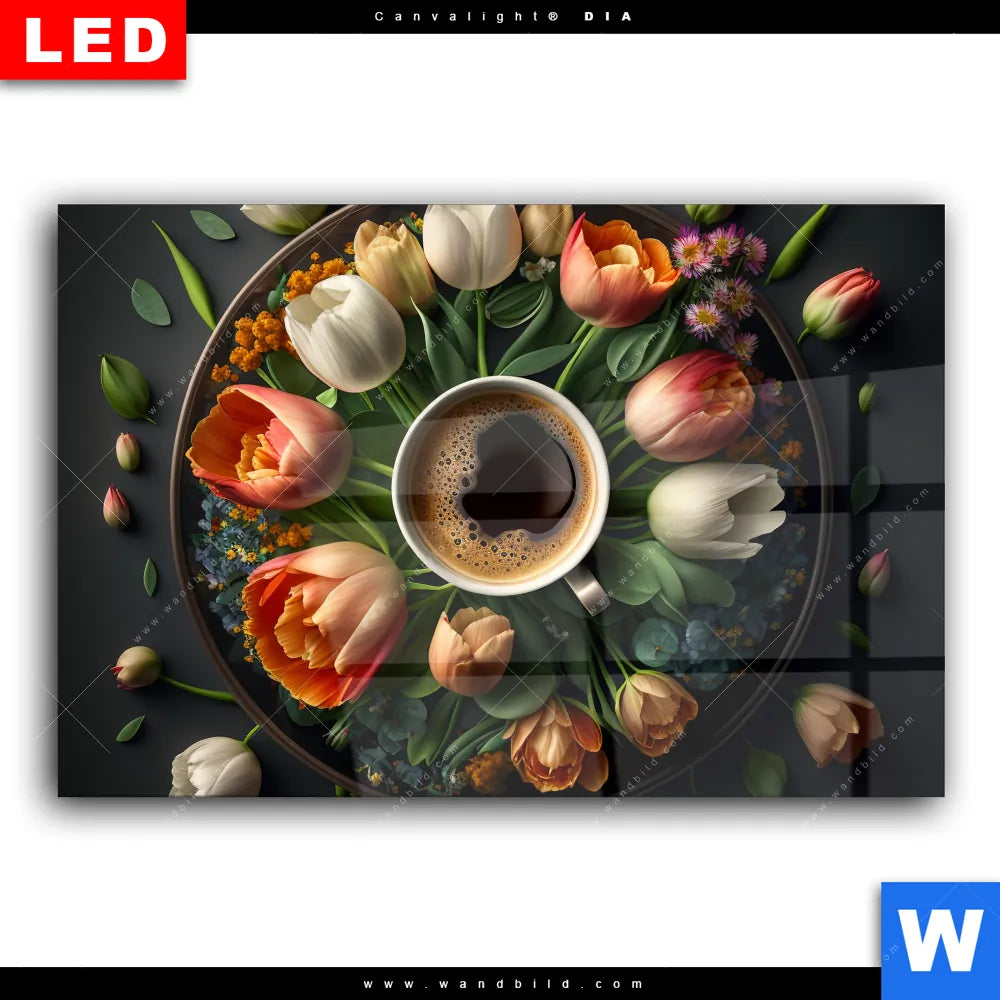 Wechselmotiv Acrylglas Canvalight® DIA | Kaffee inmitten wunderschöner Blumen | Querformat
