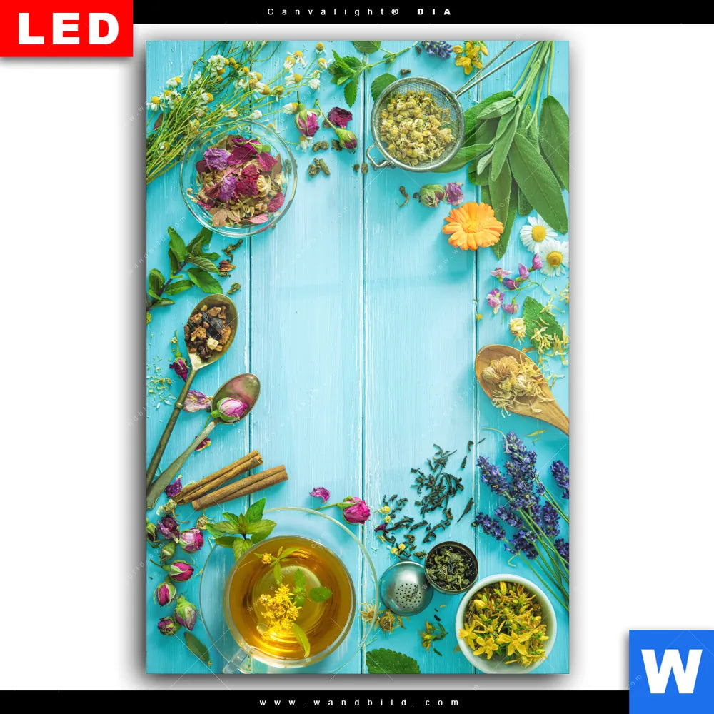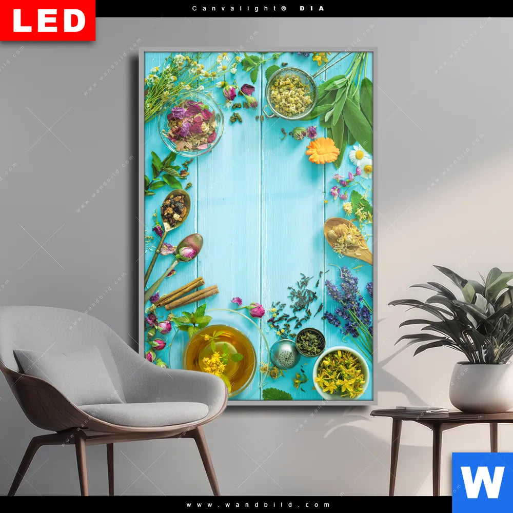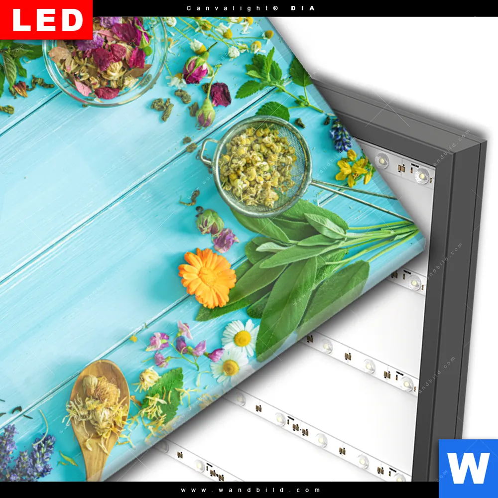 Wechselmotiv Acrylglas Canvalight® DIA | Kräuter auf blauem Holztisch | Hochformat