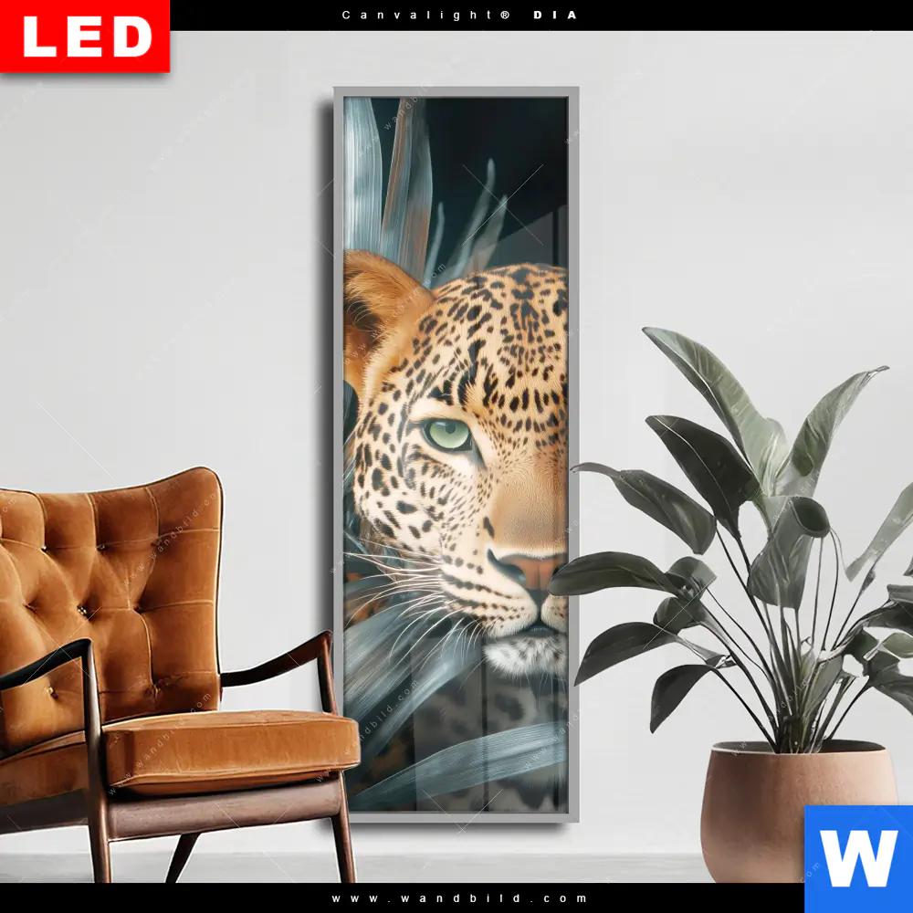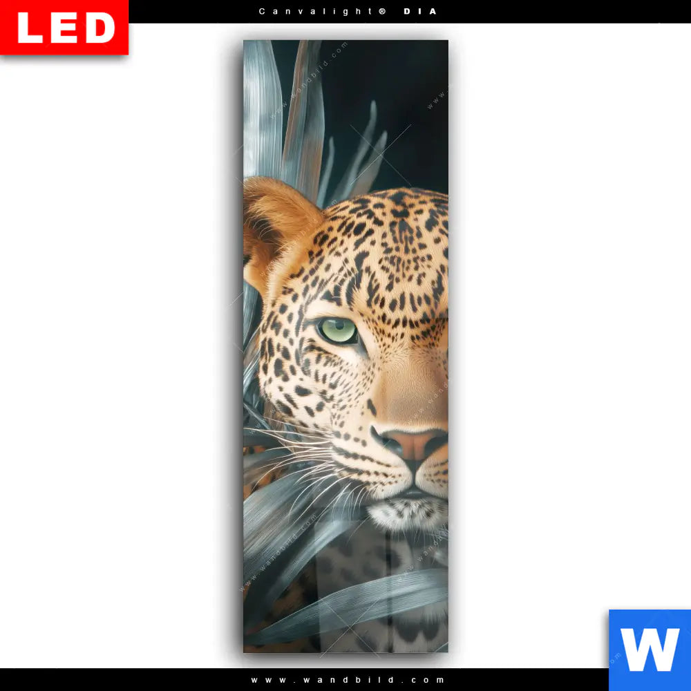 Wechselmotiv Acrylglas Canvalight® DIA | Leopard zwischen Blättern | Schmal
